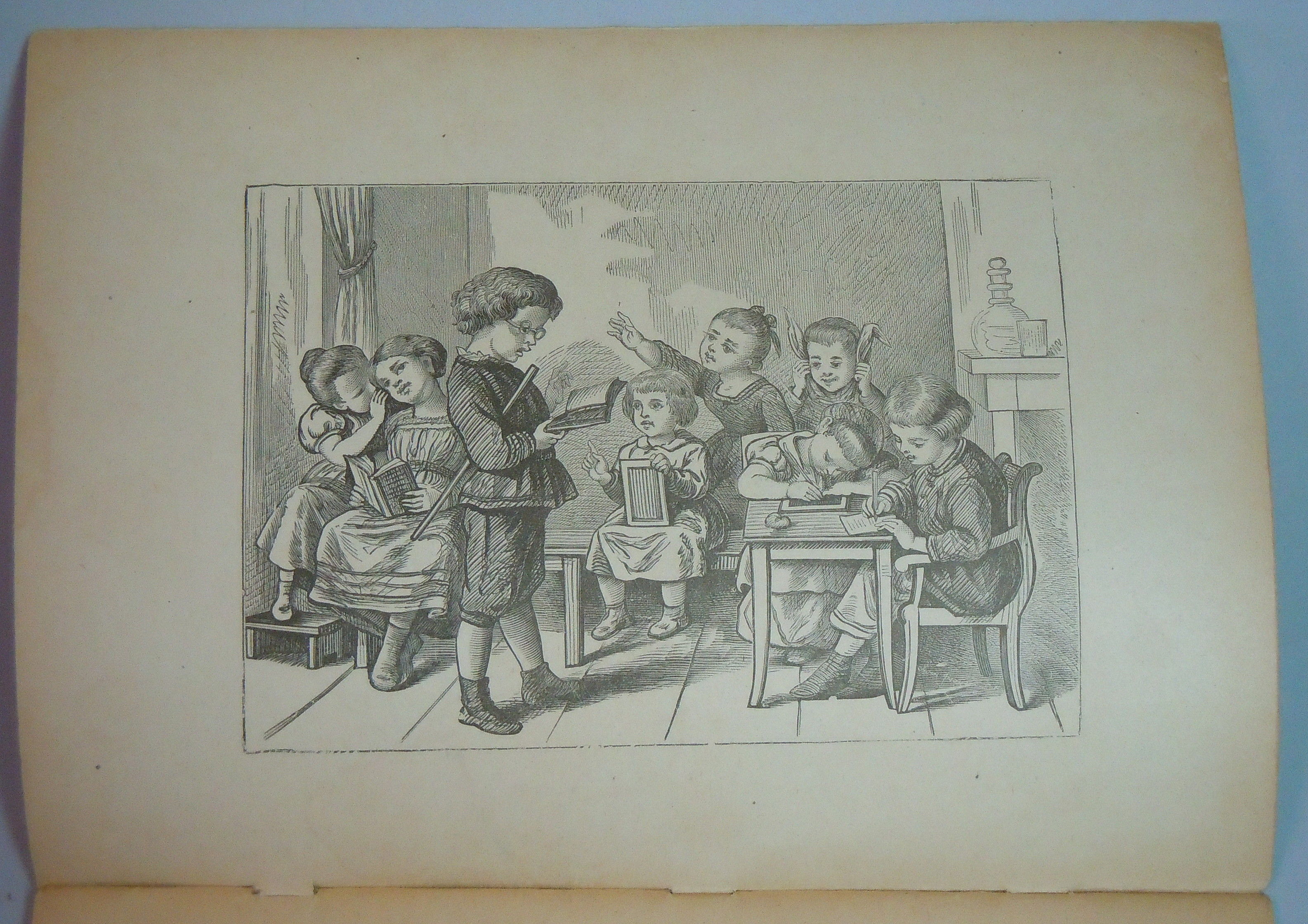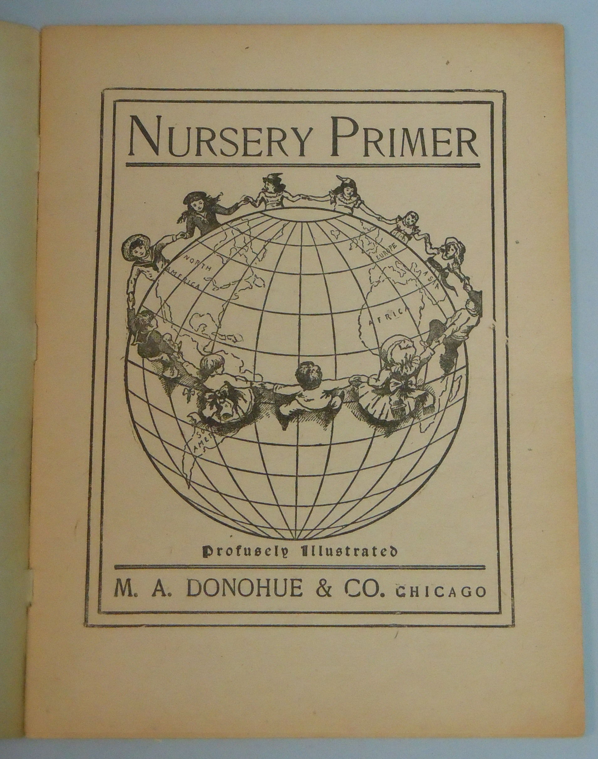 Chicago: M. A. Donohue & Co., 1916. Soft Cover. edge wear to cover; with corner bend. 24 pp primer with color illustrations of children at work and play on covers. Woodcut on inside cover depicts older child playing teacher in a classroom setting. Title page depicts a ring of children around the world. Includes 18 different lessons. Printed on pulp or short fiber paper.