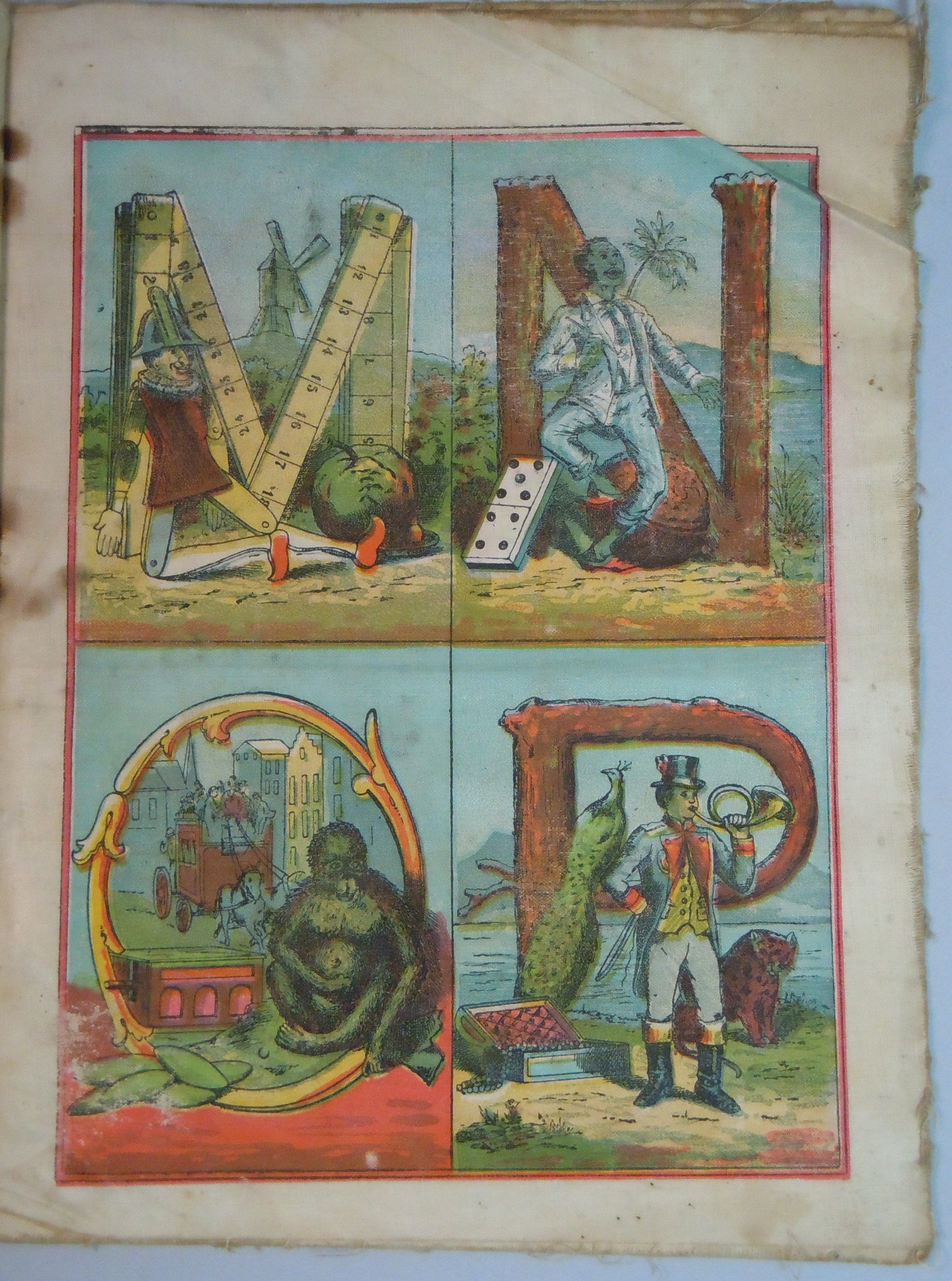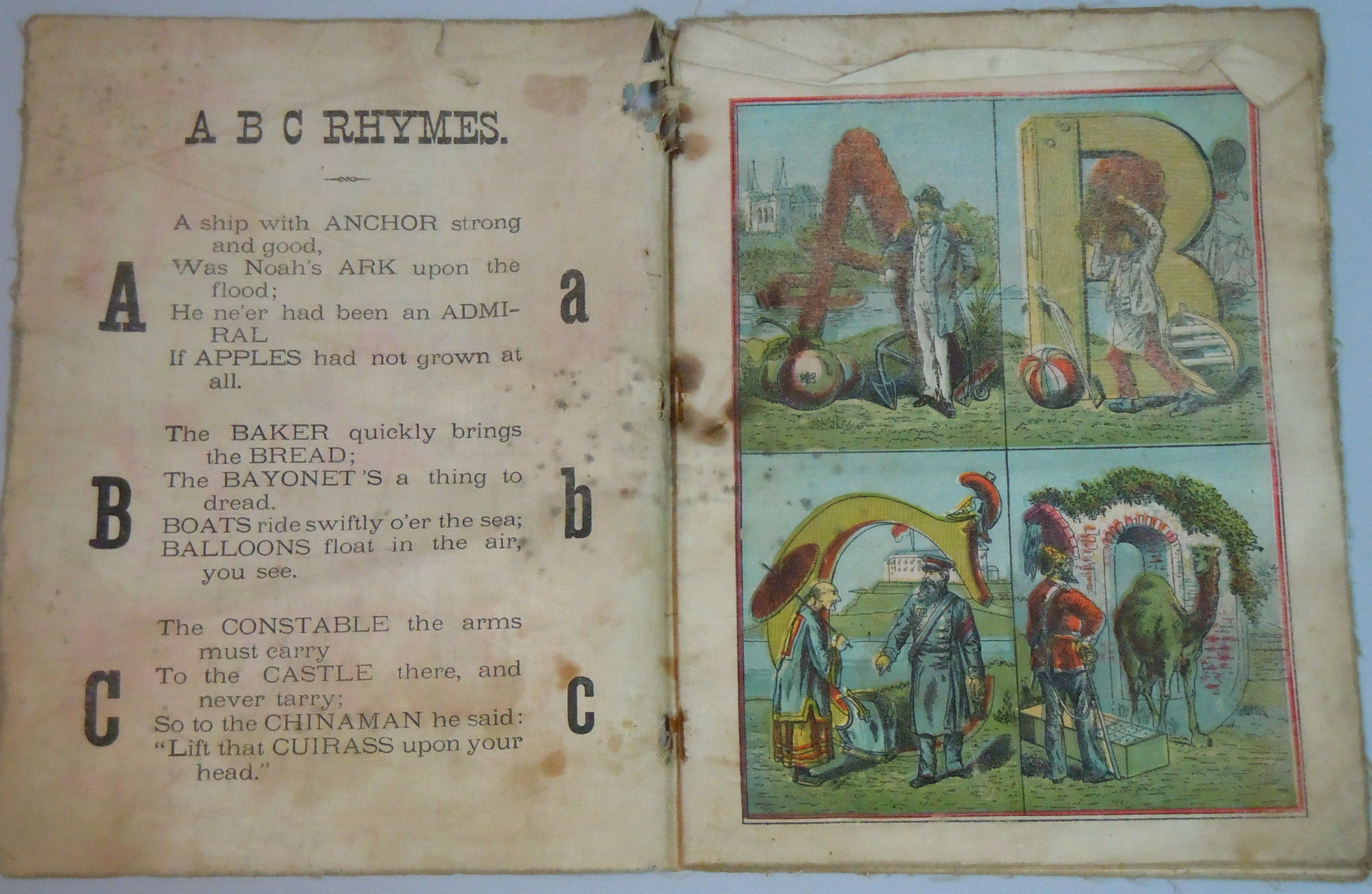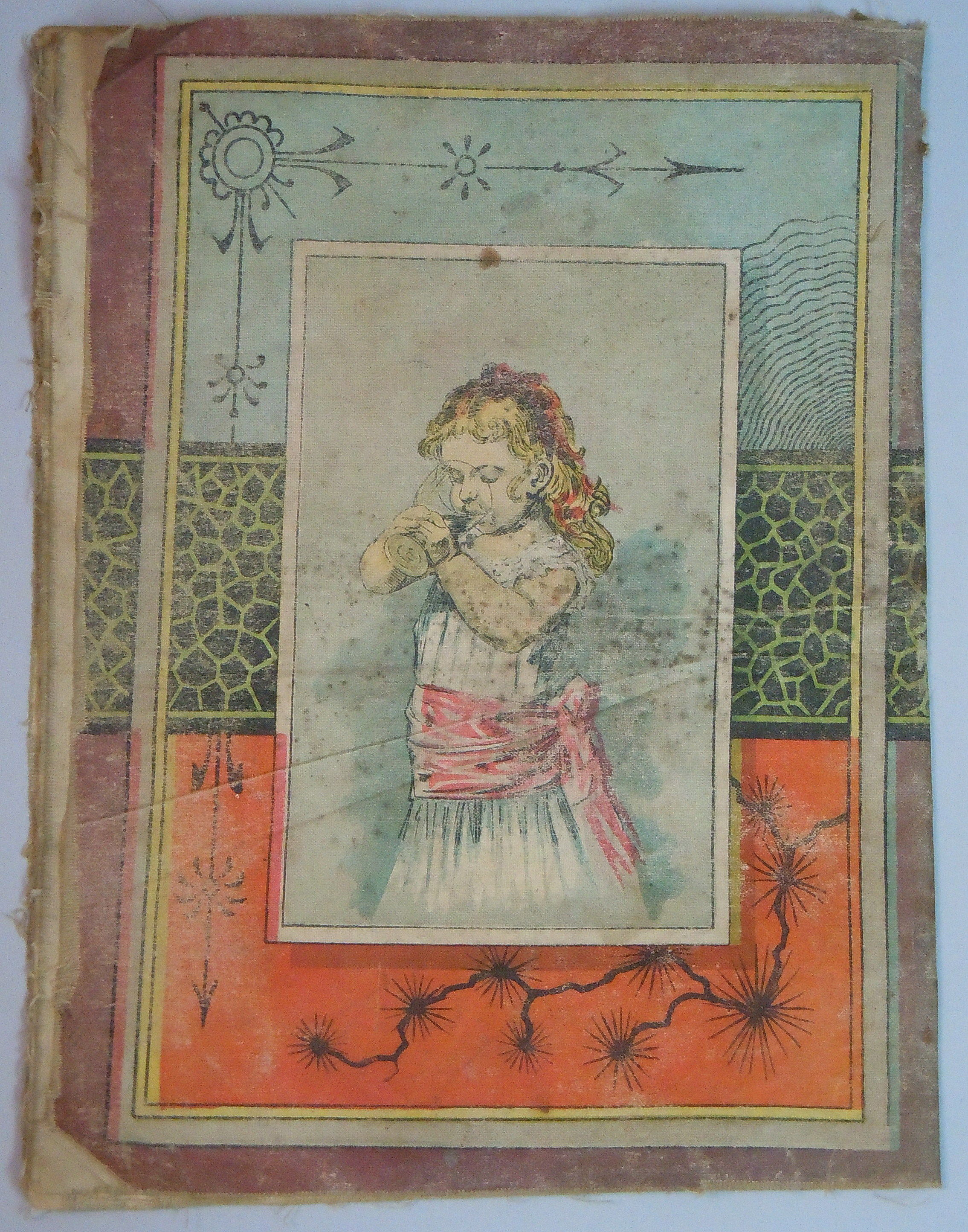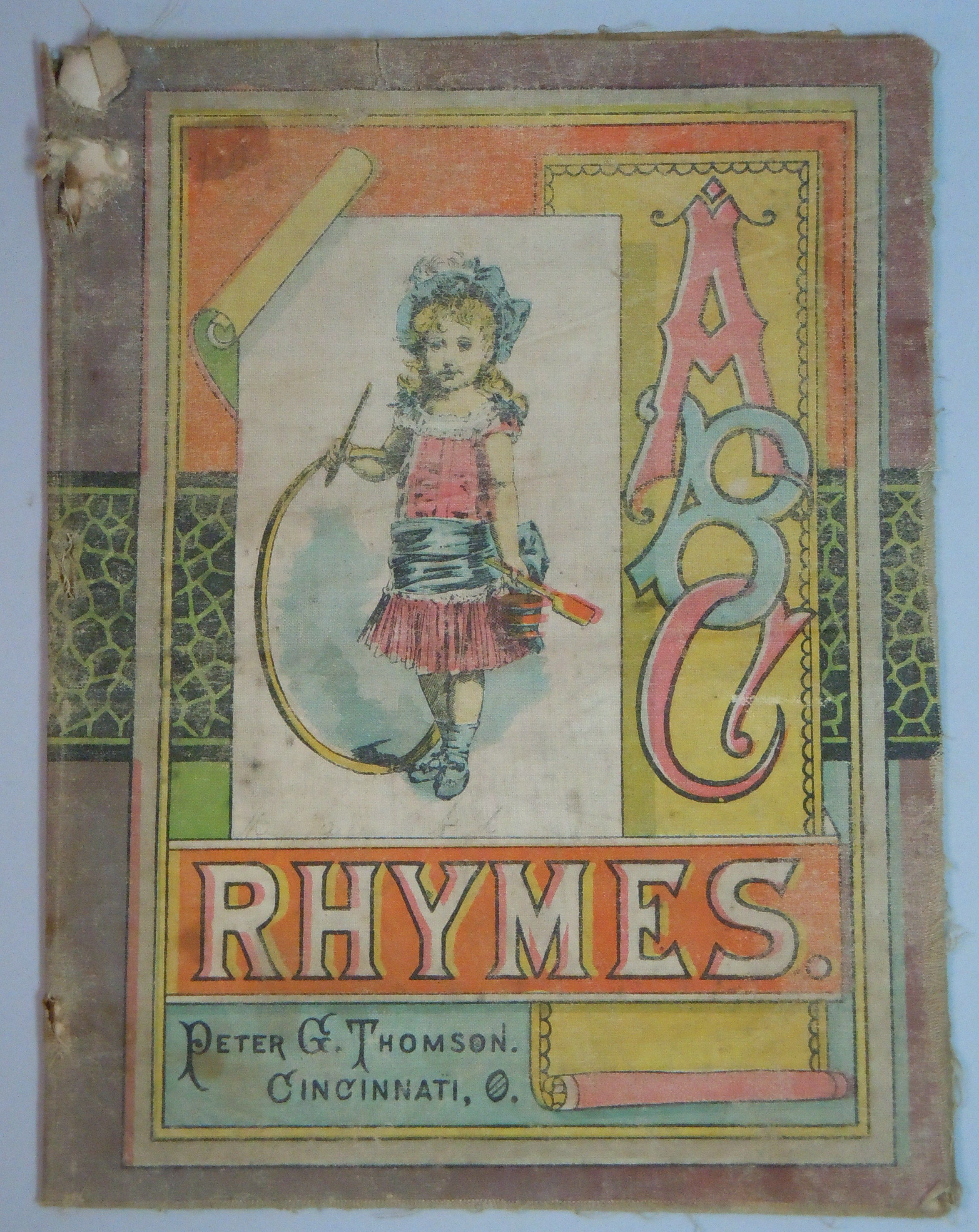 Cincinnati: Peter G. Thomson, 1880s. Heavy wear; tears upper left corner. fading; well played with.. 8vo. 14 pp. on linen. Alphabet text page with corresponding illustrations for four (4) alphabet letters on another page. K is for Kakadu, kangaroo, kiosk and kabyl--all of which are depicted in the illustatration