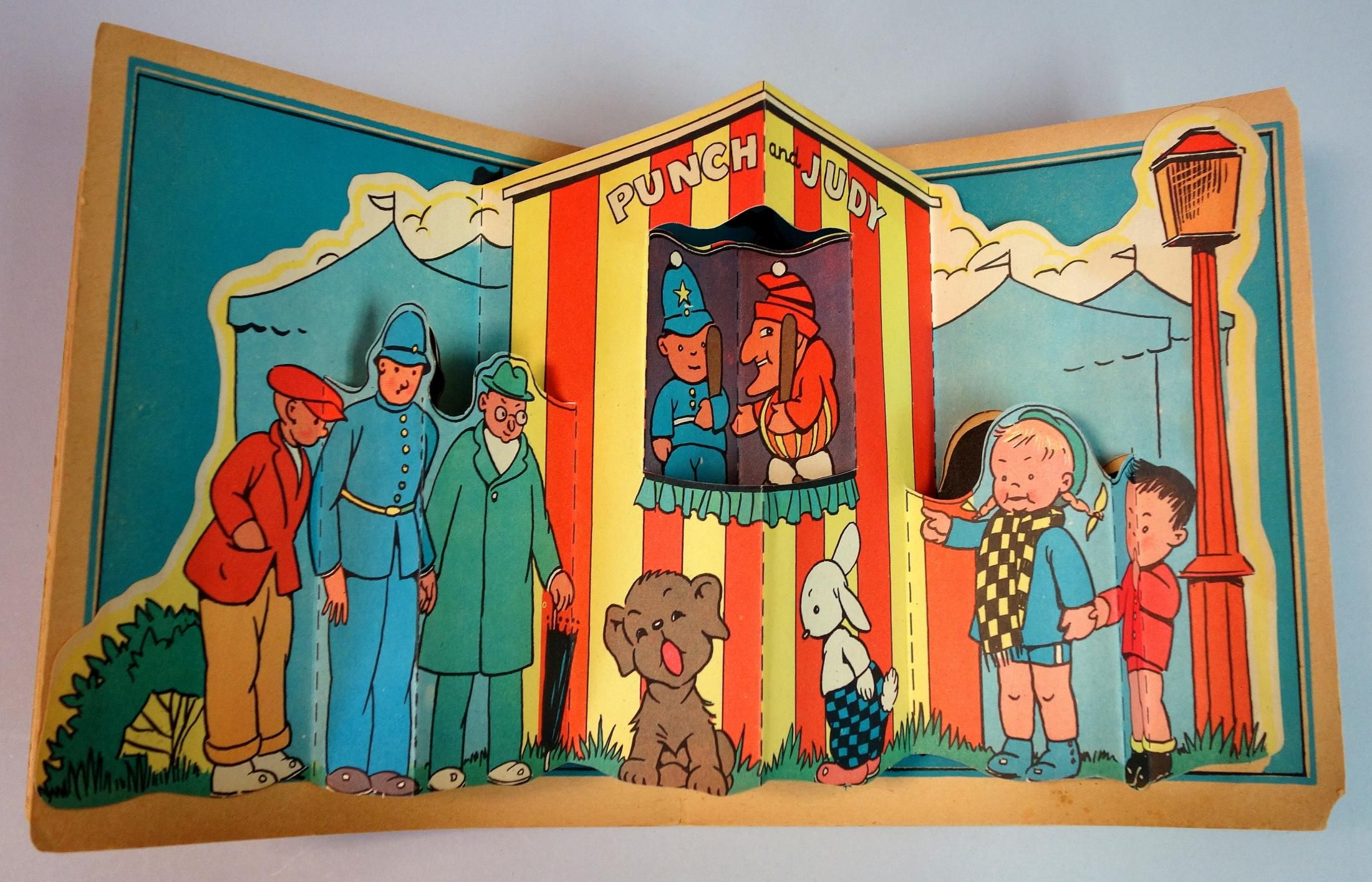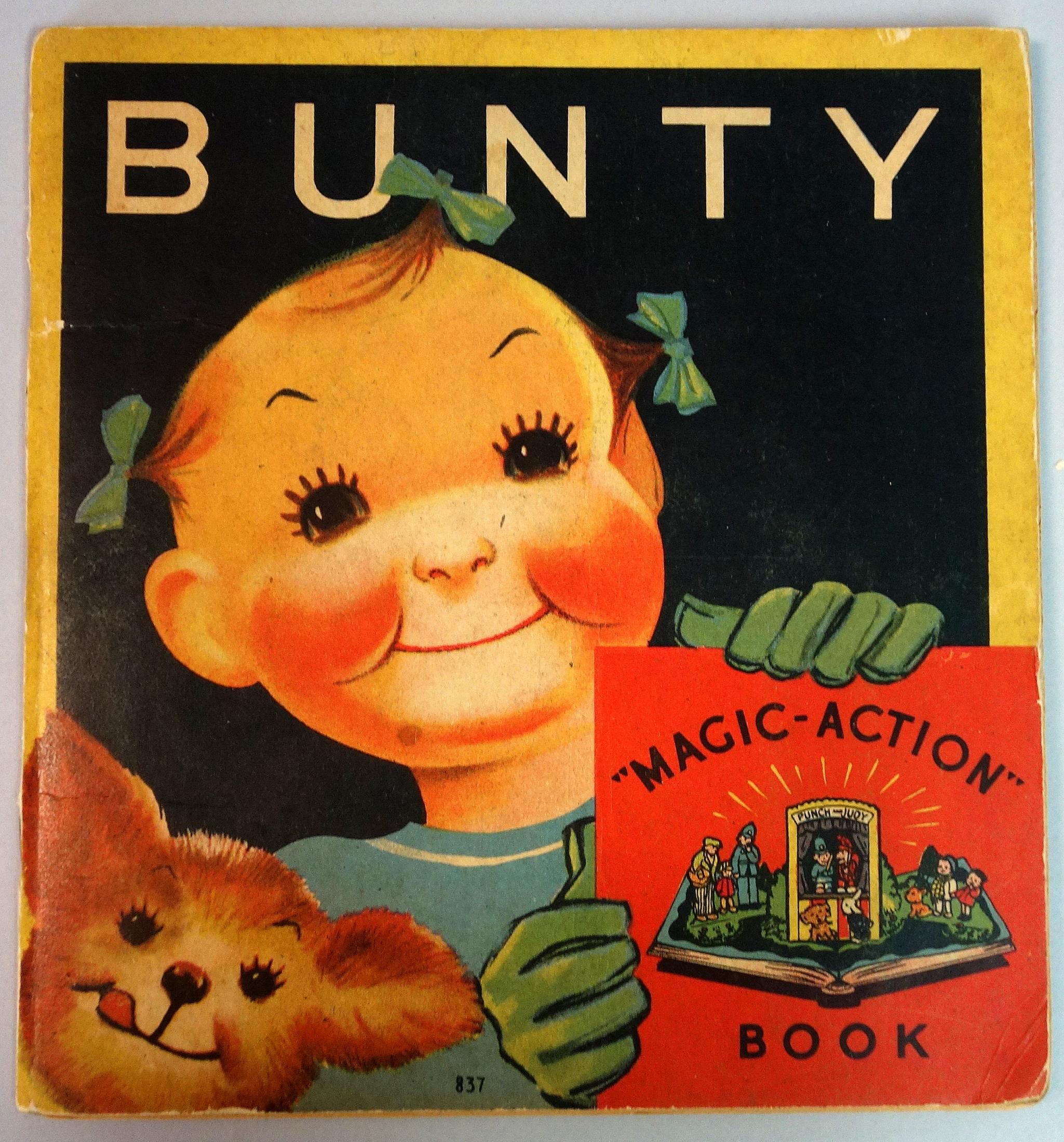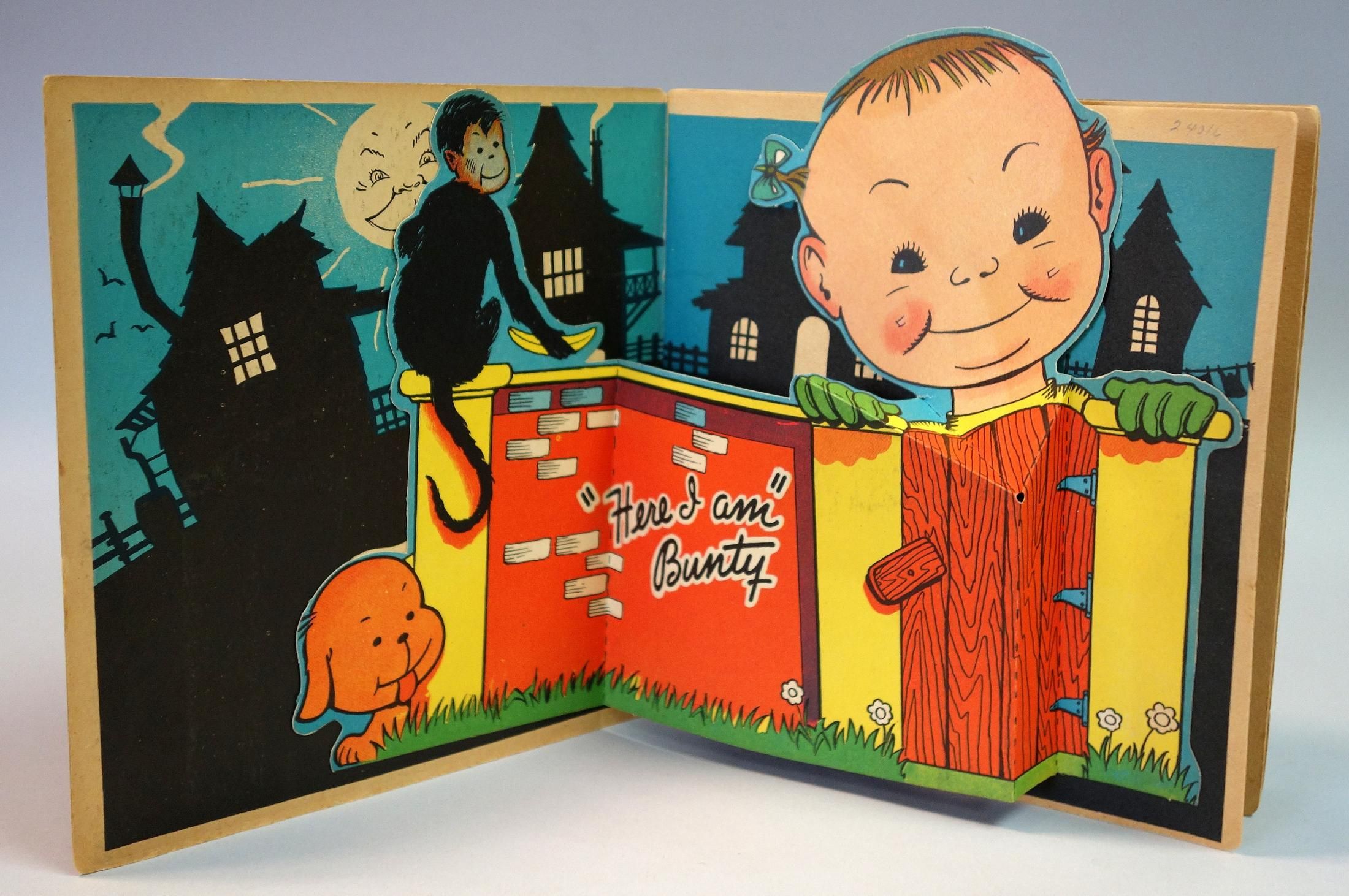 Racine Wis.: Whitman, 1935. Edge wear on covers. 25 pp. litho on board book with three (3) die-cut pops. First text page titled "The Story of Bunty. Pop-ups include "Here I am Bunty", Punch and Judy and Bunty with a policeman. In-text black and white illustrations. Measures 7 1/2" 7 3/4".