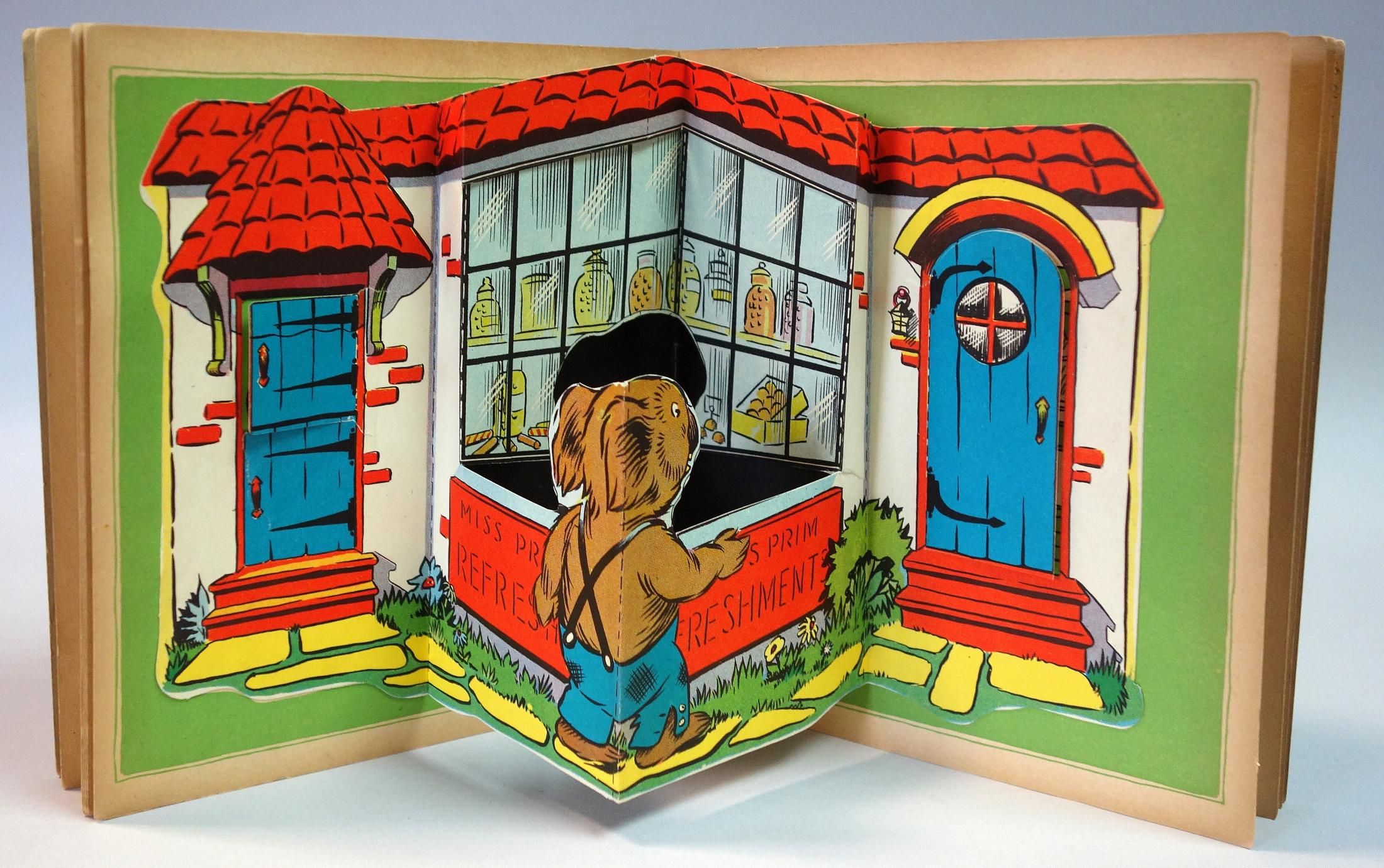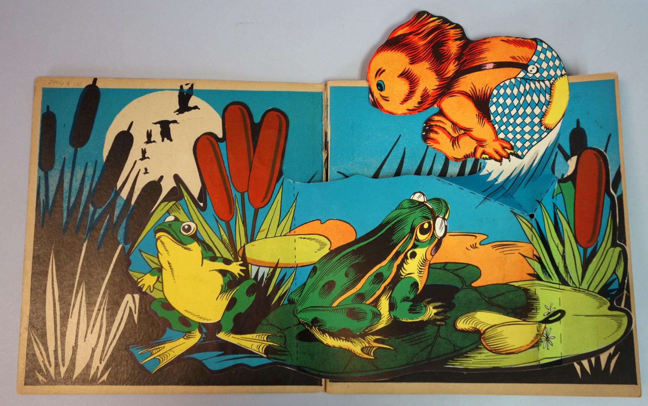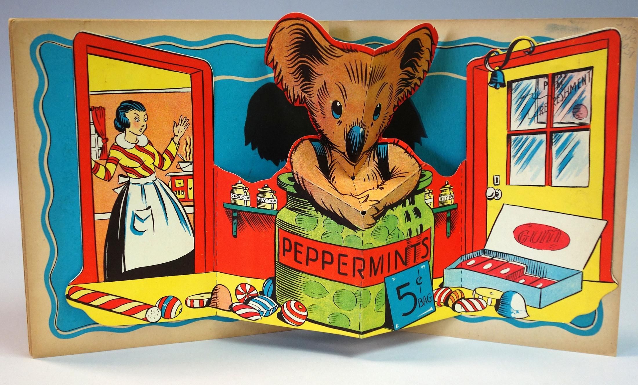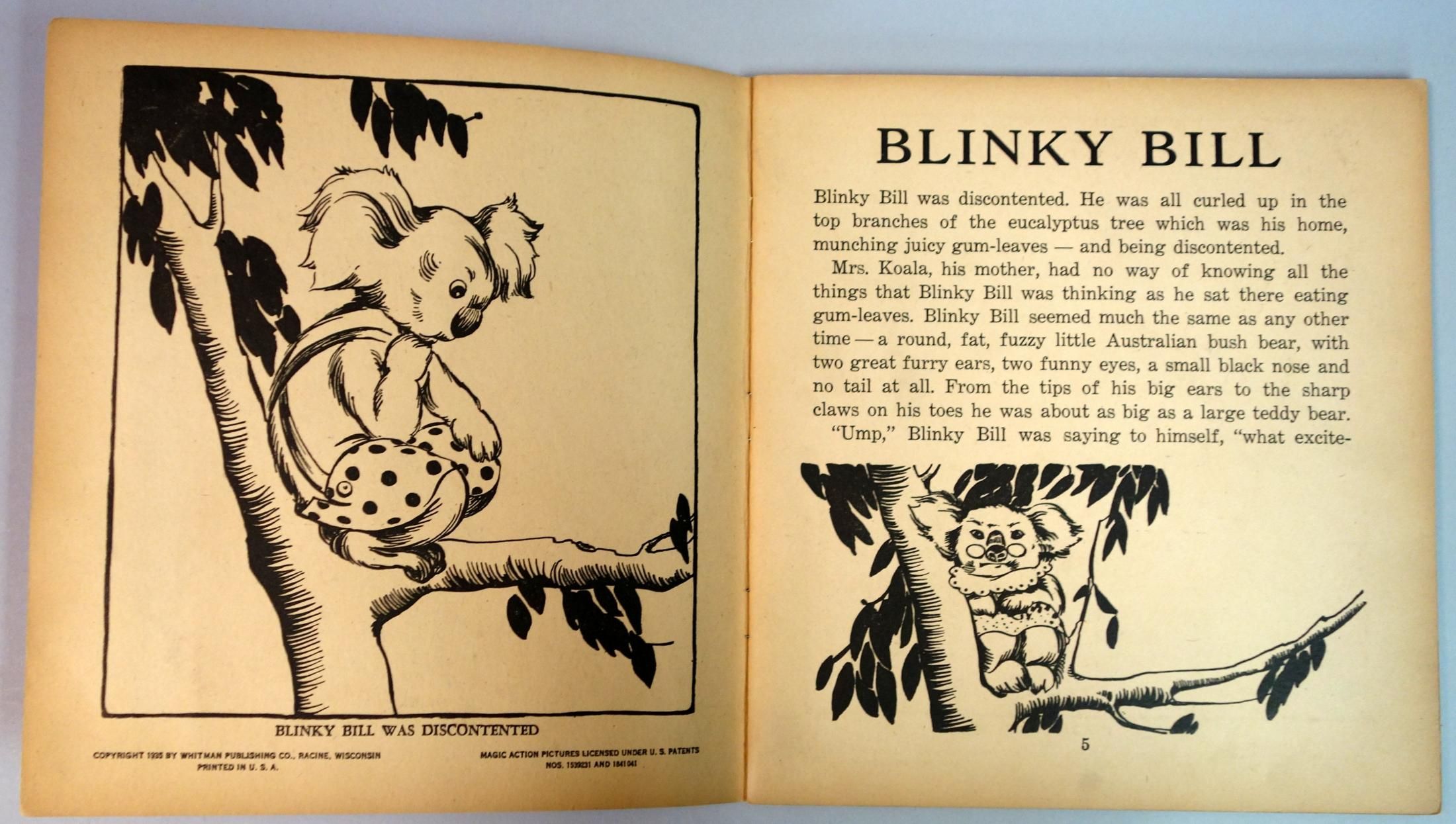 Racine Wis.: Whitman, 1935. Edge wear on covers. Erased penciling on front cover. . 25 pp. litho on board book with three (3) die-cut pops. First text page titled "Blinky Bill" Story of a discontented koala bear. Pop-ups include "Blinky with Frogs, Blinky at Miss Prim refreshments and Blinky in the Peppermints. In-text black and white illustrations. Measures 7 1/2" x 7 3/4".
