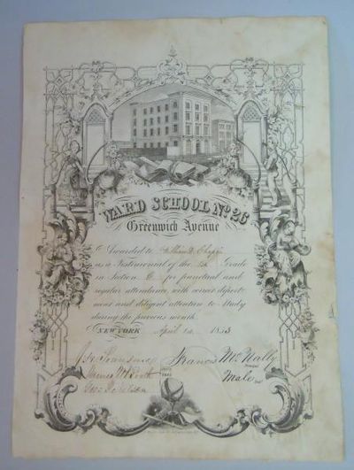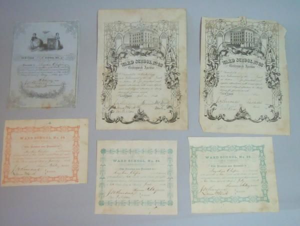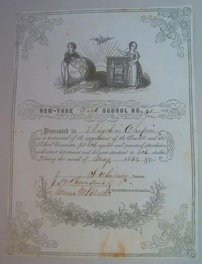 A collection of five (5) engraved Rewards of Merit from Ward School No. 26. Awarded to Angeline Chapin, 1852-1854. 38 Greenwich Ave., North Ward, New York City. Primary Department. Also includes a sixth reward from New York Ward School No. 41 , May 1851. The engraving depicts a boy leaning on the world and a girl on a lectern "Free Education" . Largest measures 8"x 11 1/4". Condition varies.