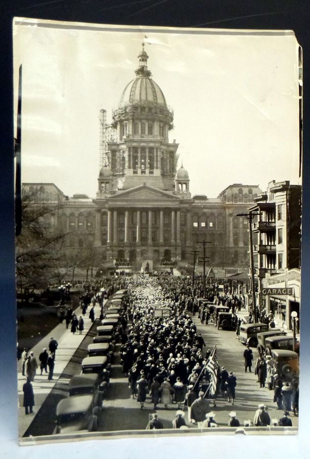 THE MARCH OF 10,000 WOMEN WHO MARCHED IN JANUARY OF 1933 IN SPRINGFIELD, ILLINOIS TO PROTEST THE MINE OWNERS USE OF CLUBS AND BULLETS TO STOP UNION ORGANIZING Large 8 1/2;" x 12" wire photograph of the women leaders of the Progressive Miners of America who marched and met with Governor Horner in Springfield, Illinois. A very nice copy in large format. Horner agreed to work to provide relief for the miners in the state. The woman who organized them was Agnes Burns Wieck known as "the Mother Jones of Illinois". John L. Lewis fought them and was viewed as in the pockets of the mine operators (he had originally supported Herbert Hoover). The 10,000 women marched in white uniforms and red scarves and became lionized by the nation.