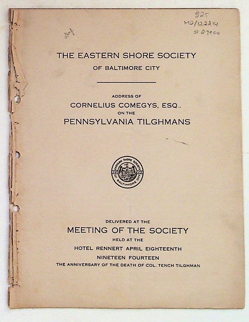 Baltimore: The Eastern Shore Society of Baltimore City, 1914. Paperback. Very Good -. Paperback. Delivered at the meeting of the Society held at the Hotel Rennert April 18th, 1914, the anniversary of the death of Col. Tench Tilghman. SCARCE. White paper wrappers with black title to spine. Disbound but complete. Writing in pencil to inside of rear wrapper. Text is clean and bright. 10 pages. MD/122214.