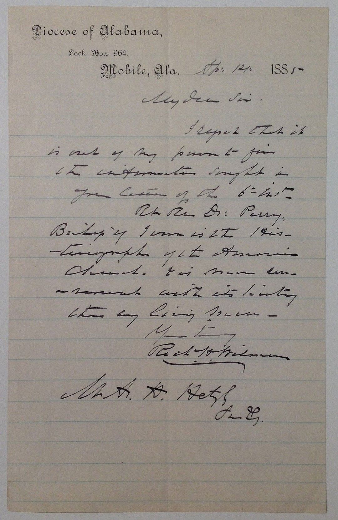 Mobile, AL, 1885. unbound. 1 page, 9.5 x 6 inches, Mobile, Alabama, April 12, 1885. Signed "Richard H. Wilmer" in his difficult-to-read handwriting, responding to an inquiry concerning church policy, in part: "...I report that it is out of my power to join the information sought in your letter of the 6th instant. Right Reverend Dr. Perry, Bishop, is his holiness of the American Church..." Natural folds; near fine condition.