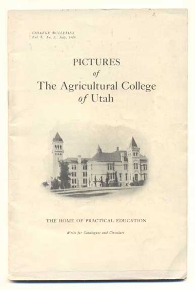Logan, UT: Agricultural College of Utah, 1909. Original edition. Paperback. 38pp. Very slim octavo [21.5 cm] Stapled yellow and black pamphlet wraps. Very good. The wraps are very lightly soiled, and they are a little abraded along the bottom edges. A photographic history of a Utah college offering degrees in Agriculture, Domestic Science, Commerce, and General Science. Includes illustrations of The Poultry Plant, Sheep and Cattle Barns from the Southwest, Suite of Sewing Rooms, A Laundry View- Artificial Drying Apparatus, The Main Commercial Room, and more.