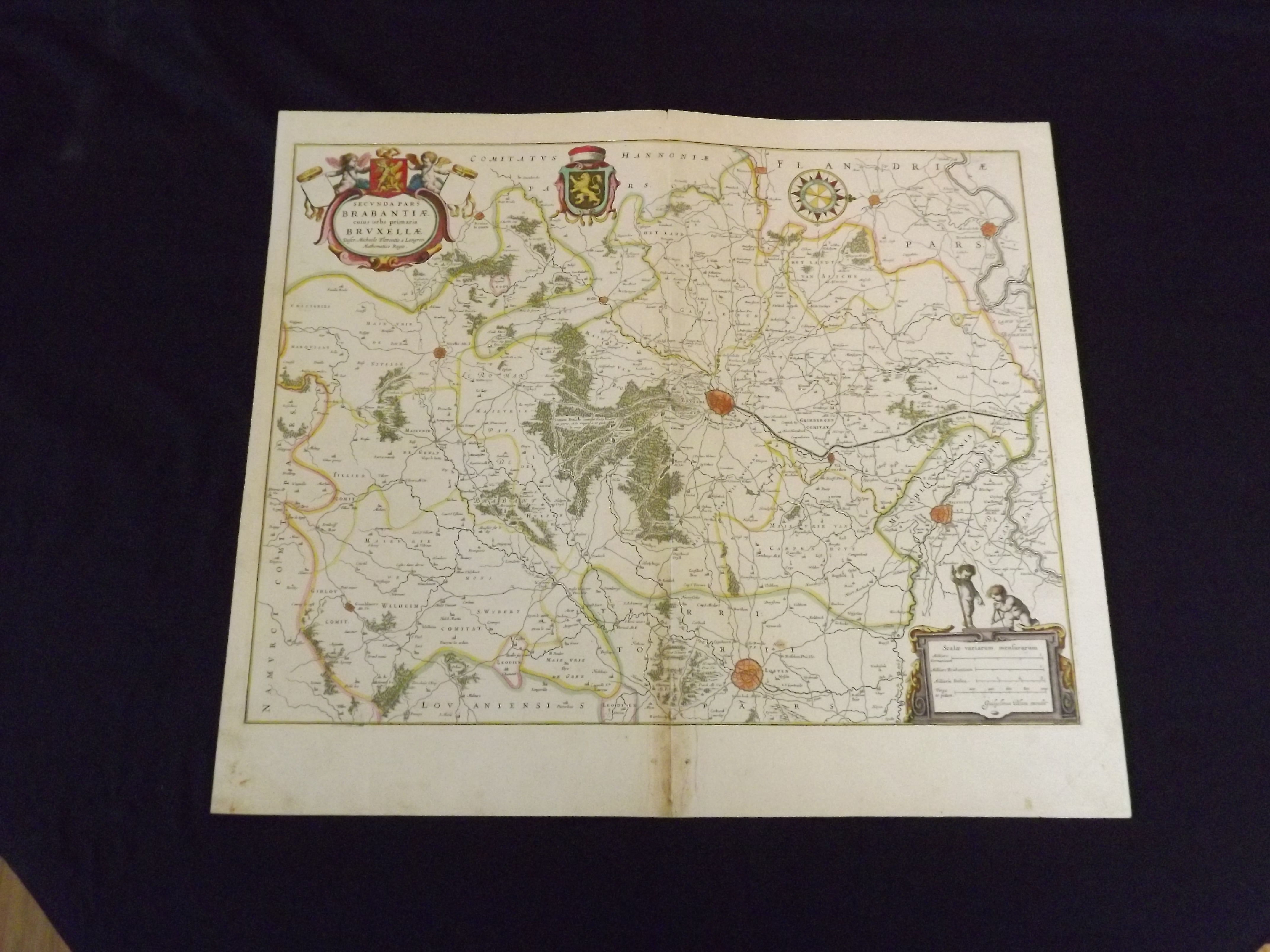 Large double page map (22" x 19 1/2"), some coloring, text title cartouche in the upper left corner, also includes a second less elaborate cartouche and a coat of arms. Unclear when coloring was done, some tape repairs at fold on verso, some discoloration in bottom margin from tape, left margin about 1/2 inch (this is normal for this map), but other margins are ample, text on verso, some minor soiling, staining and browning; otherwise very good. Willem Blaeu (1571-1638) was the founder of one of the great cartographic publishing dynasties, which produced some of the best maps of the period. This is very attractive early map showing part of Brabant in the Netherlands, and is centered on Brussels. The map also shows a large forest and key roads, and includes an attractive cartouche and coat of arms. Van De Gohm p. 104-106.