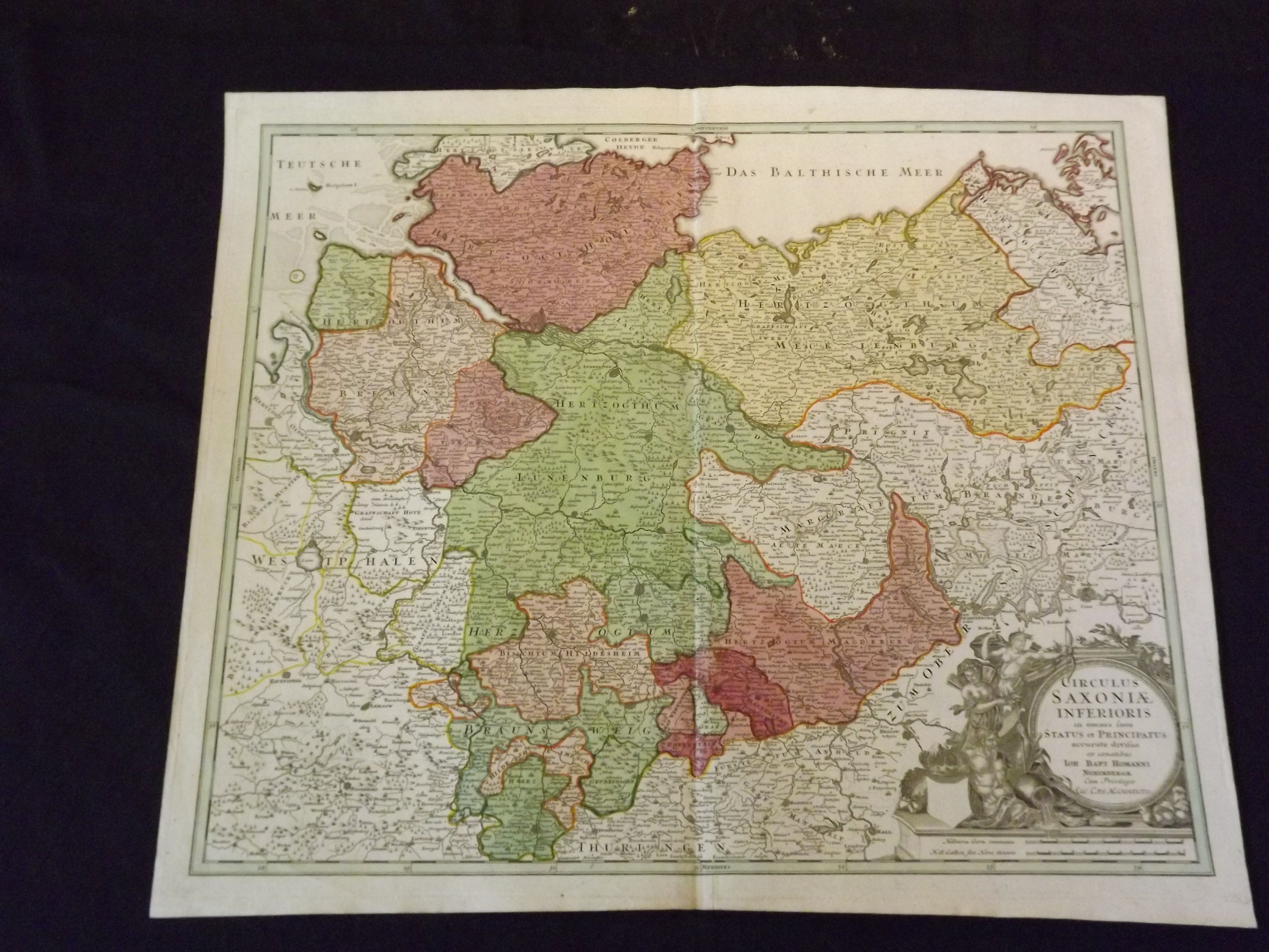 Engraved double page (23 1/2" x 20 1/2 "), hand colored, large title cartouche. Slight darkening at centerfold, slight aging and browning, ample margins; about near fine with a strong impression. Johann Baptist Homann (1663-1724) was considered the father of German mapmaking, and in 1715 was actually appointed the Geographer to the Emperor. He founded his mapmaking business in 1702, and he would produce several major atlases between 1707 and 1716. This is a very attractive map of the northern part of Germany, and includes the cities of Hamburg and Berlin. Van De Gohm: Antique Maps. Bagrow: History of Cartography.