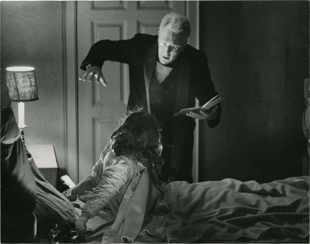 Burbank, CA: Warner Brothers, 1972. Vintage oversize borderless double weight black and white photograph from the 1972 film. An amazing image, showing Max von Sydow looming above—and seemingly beyond—a very possessed young Linda Blair.