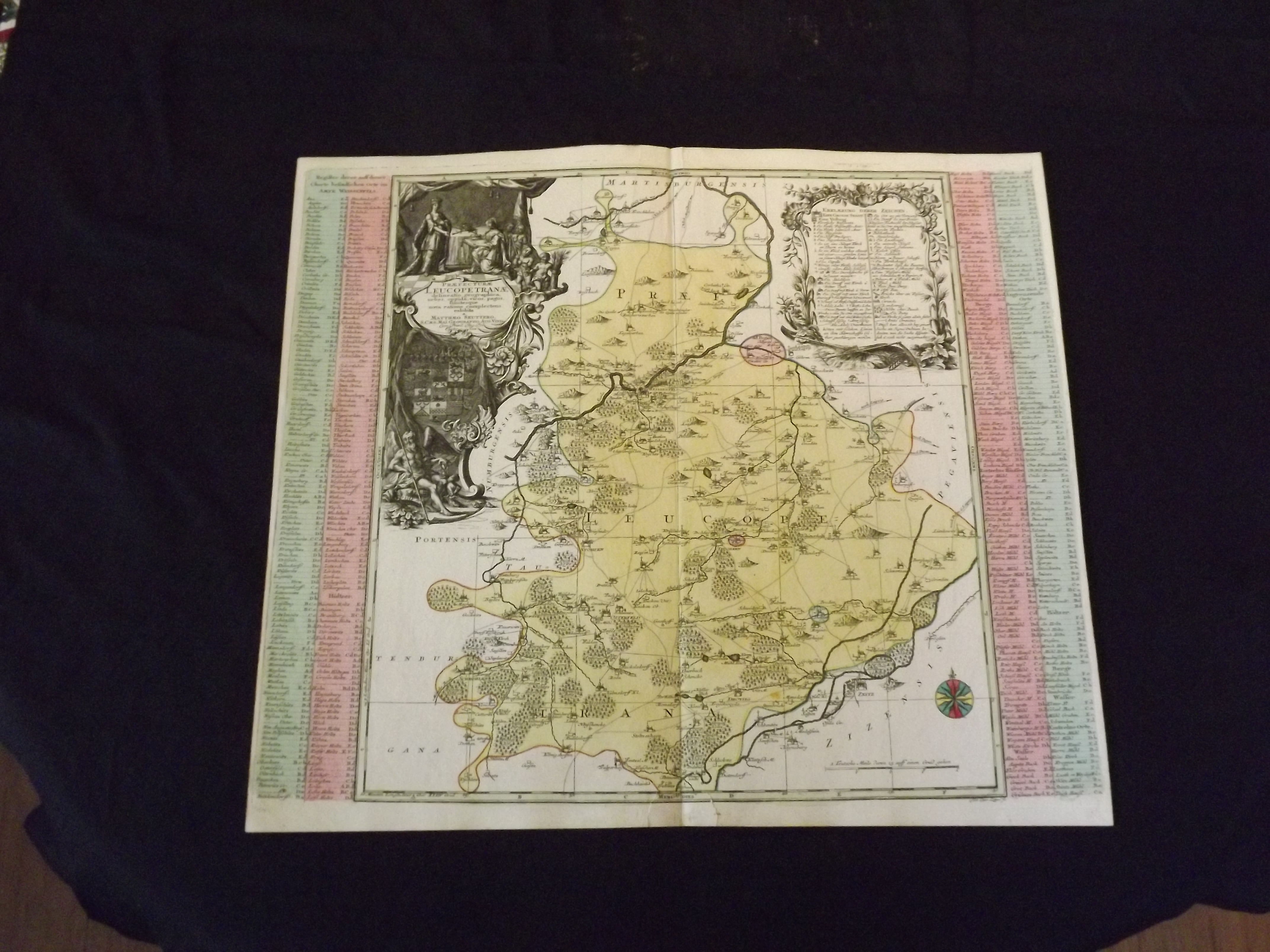 Engraved double page map, 23 1/4" x 20 1/2", hand colored, elaborate large title cartouche. Archival tape repair at centerfold in bottom margin, normal aging and browning; otherwise very good plus with a strong impression. Seutter (1678-1757) was born in Augsburg, and served as an apprentice with Homann before establishing his own firm in Augsburg in 1710. He was considered one of the most important German cartographers, but it seems that much of his work He published several atlases, and globes, but his most famous work was his "Geographical Atlas or an Accurate Depiction of the Whole World" published in 1725. This map is of the Weissenfels area in the Sachsen-Anhalt region of Germany. While the title on the map suggests a different location, a map published by Peter Schenk a few years later is almost identical, and clearly indicates Weissenfels. The map is attractive and colorful, and is decorated with a large title cartouche in the upper left corner. matthias-seuter.com. Bagrow p. 185 & 272.