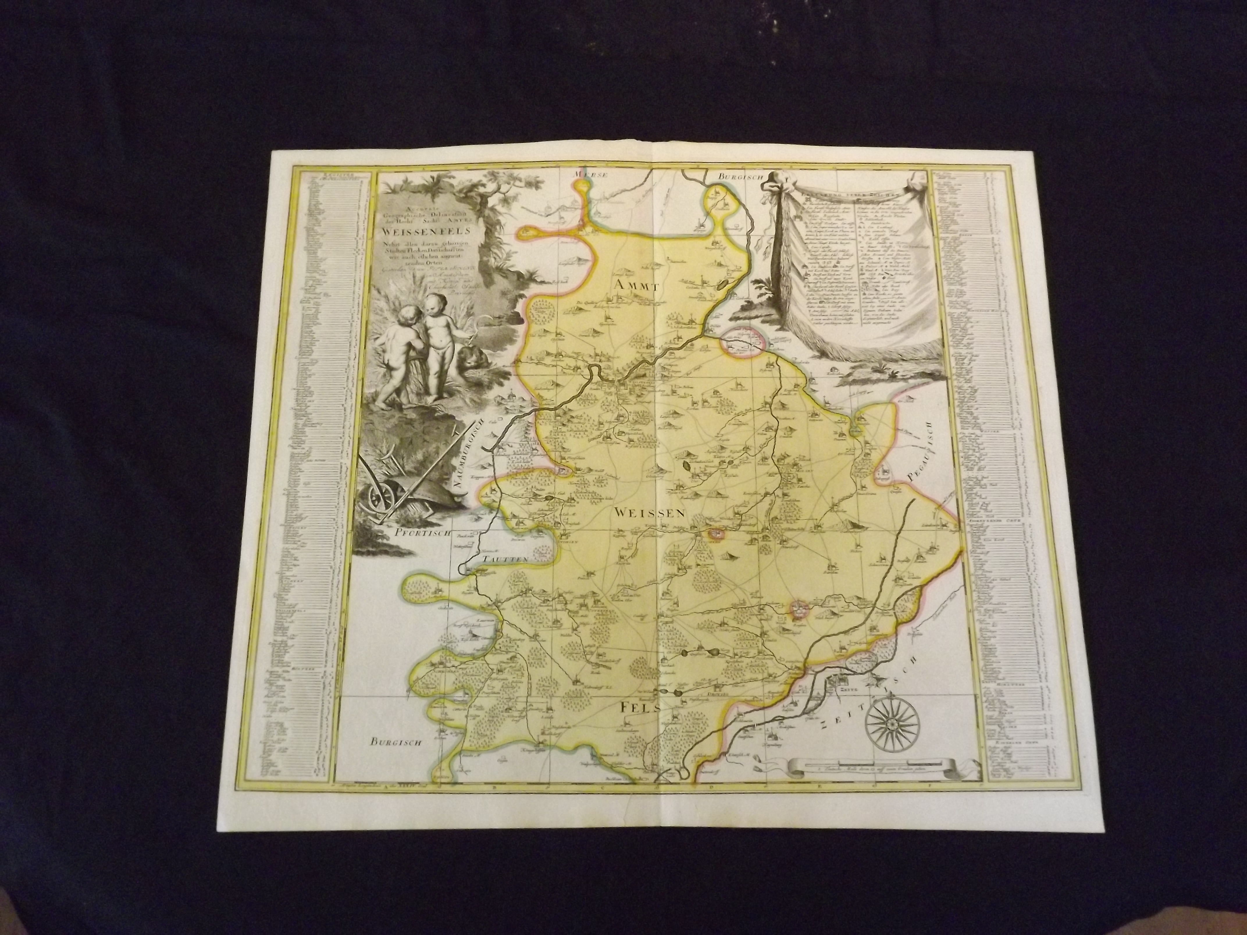 Engraved double page map (23 1/2" x 20 1/2"), partially hand colored, large decorative title cartouche, edges with two columns of text. Archival tape repair in middle of the bottom margin, normal aging; otherwise about near fine. Very nice impression. Peter Schenk (1693-1775) was the son of Peter Schenk the Elder, another well-known Dutch cartographer. He was a fairly prolific mapmaker, and appears to have been active in Leipzig. The present map is bright and attractive, and is of the town and region of Weissenfels. It is very similar to a map published by Mathew Seutter a few years earlier. The map includes a larger decorative cartouche, which contains the title. Bagrow: History of Cartography.