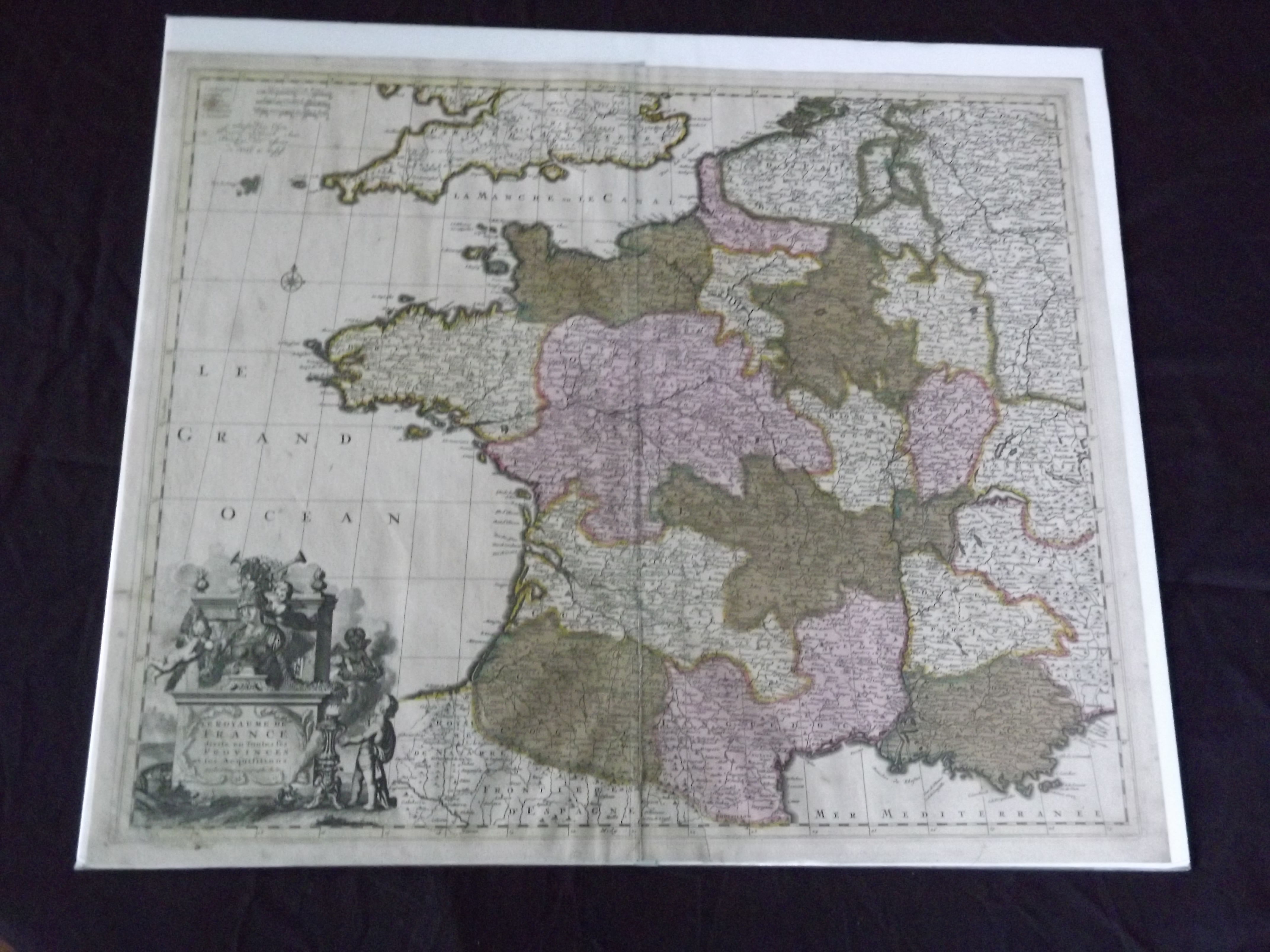 Copper engraved map, double page, (24" x 20"), hand colored, and large uncolored title cartouches. Some minor soiling, a little wear along centerfold, with old verso repair, normal aging; very good. Samson (1600-1667) is often referred to as the father of French cartography. Louis XIII was impressed with his work and appointed him "Geographe Ordinaire du Roi". During his career Sanson would produce about 300 maps, and his major atlas "Cartes Generales de Toutes les Parties du Monde" would represent an important part of his body of work. While two of his sons continued publication of his maps after his death, Pieter Schenk (1655-1718), an important publisher and engraver in his own right, published this map. The map is attractively colored and gives a detailed view of the provinces of France. The map is also decorated with a large title cartouche. Bagrow p. 185. map hist website.