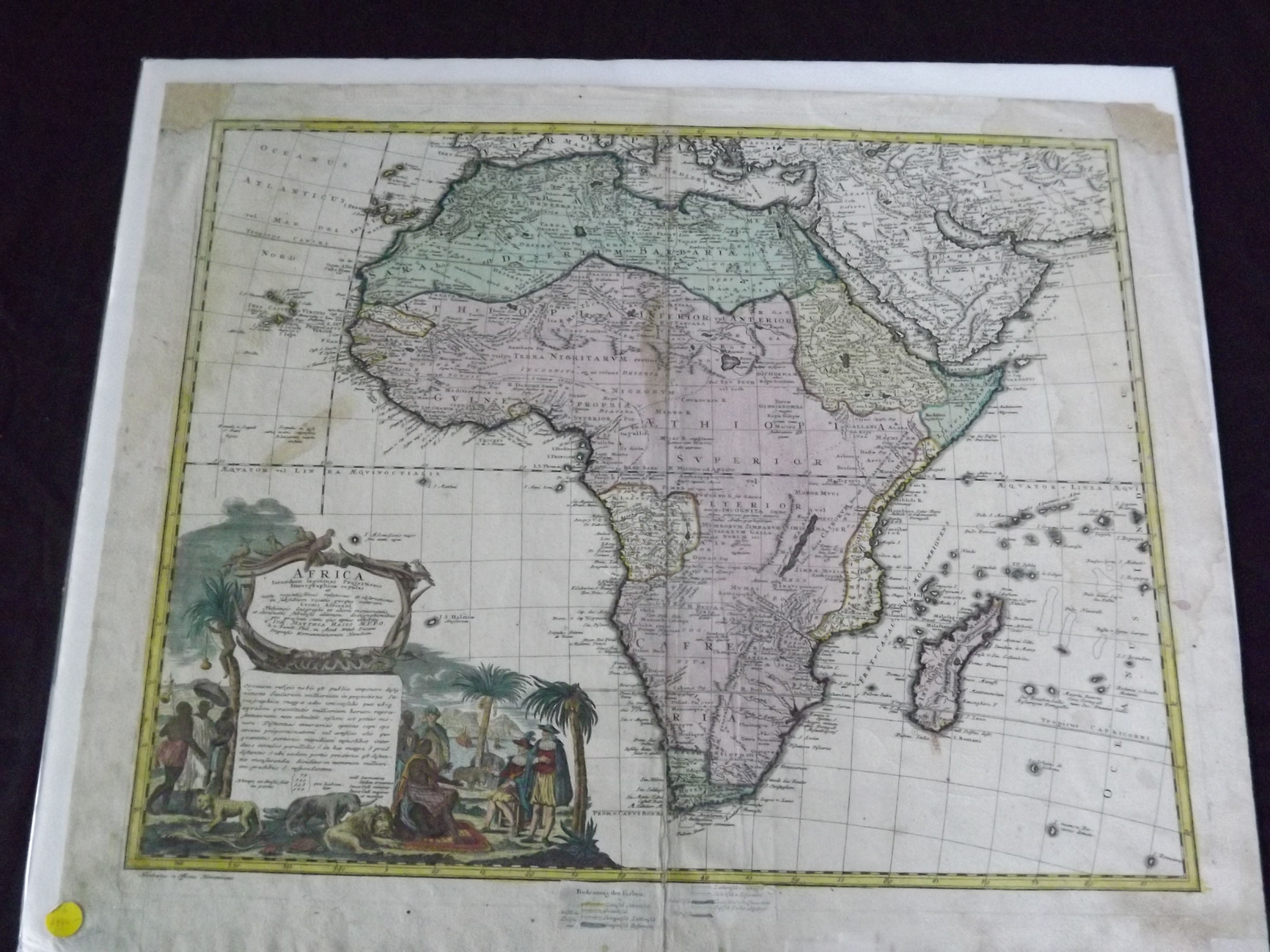 Engraved double page (24 1/2" x 21 "), hand colored, large title colored cartouche in bottom left corner. Scattered browning, soiling, and dampstaining, which affects the image somewhat, but not overly obtrusive, lower portion of vertical fold crudely closed on verso, but repairable, some repairs to corners, wide margins, small publishers letterpress key labels mounted on lower left margin; despite its faults a still very attractive map. This handsome 18th century map of Africa presents Homann's 1715 map of Africa updated by Johann Matthias Hass to include new cartographic developments included by Delisle and D'Anville in their maps. The decorative cartouche shows Europeans negotiating with an African prince, with exotic flora and fauna including lions, a leopard, elephants, a rhino, a crocodile, tropical birds and an unidentified reptile complete the composition. An interesting feature of the cartouche is that the African prince is sitting on the back of another person. The map appears to provide an accurate depiction of Africa in the early part of the 18th century, without many of the fictitious lakes and rivers of earlier maps. Homann focuses on the known coastal regions of the continent, leaving the interior sections largely blank or marked Terra Incognito. On this map Egypt, Nubia and Abyssinia are shown as distinct entities. Norwich # 83.