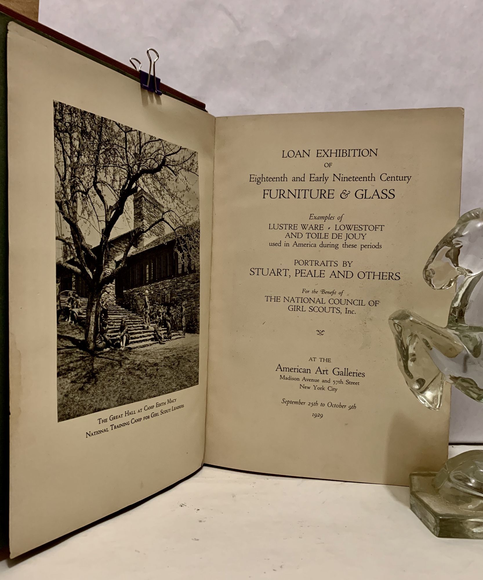New York: American Art Galleries, 1929. First edition. Hardcover. Maroon buckram, spine lettered in gilt. Very good. 28 x 19.5 cm. Unpaginated. 926 entries, most are with full descriptions and illustrations (photographs). Portraits by Stuart, Peale and others, lustre ware from England, Lowestoft from China; for the Benefit of the National Council of Girl Scouts, Inc. Exhibition September 25th to October 9th, 1929. Fresh, very clean copy with original gray wrappers bound-in, bookplate.