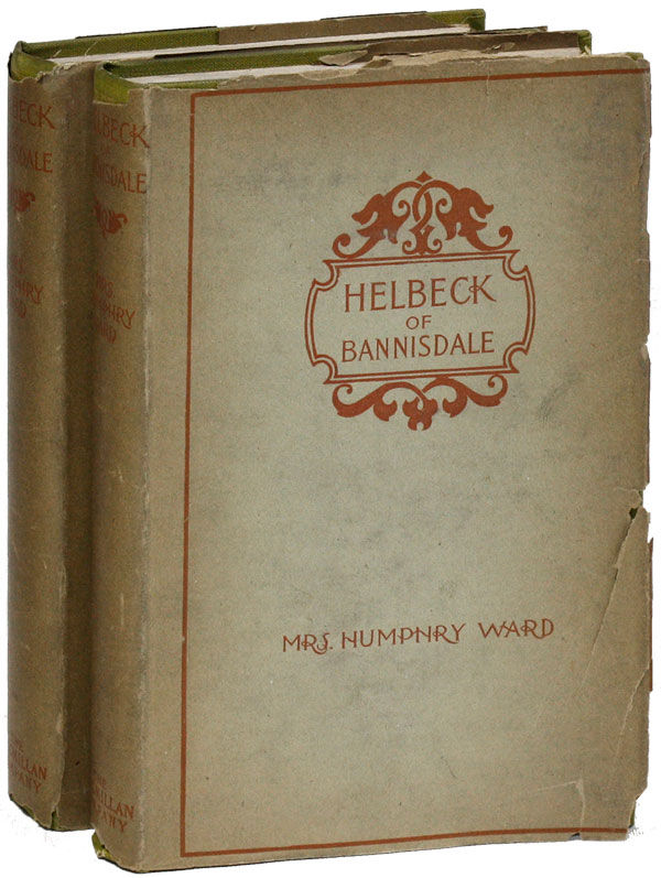 New York: Macmillan Company, 1899. Reprint. 2 volumes, small octavo (18.5cm.); original cloth in green-grey dust jackets printed in orange. Jacket spines uniformly darkened, shallow chips and tears, including to spine ends, front jacket flap of Vol. II separated but present, other flaps nearly separated at folds; Very Good in About Good, complete and exceedingly fragile dust jackets. Popular Australian-born British novelist, Helbeck being one of her five best-sellers, originally published in 1898.