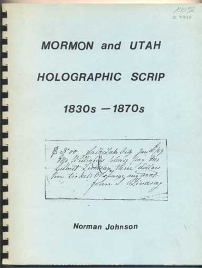 1986. First edition. Spiral Bound. 111pp. Quarto [28 cm] Very good condition. Black plastic spiral binding with pale blue and black printed wraps. With numerous illustrated figures. Very good, with subtle fading to the edges of the wraps. The focus of this study, handwritten scrip, is a subject the author believes has received little attention, by comparison to "Mormon money." Here, Johnson concerns himself with various documents used to prove that the holder or bearer is entitled to receive something, and does not deal with Mormon currency and coin.