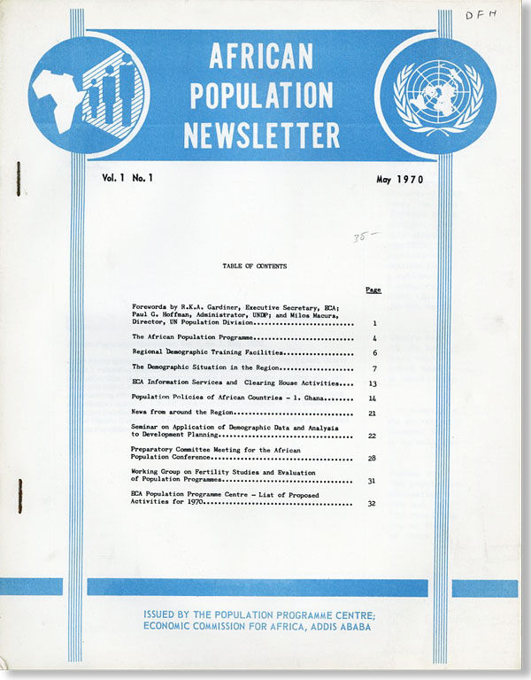 Addis Ababa [Ethiopia]: Population Programme Centre, 1970. First Edition. Quarto (28cm.); decorative staplebound self-wrappers printed in blue and black; mixed pagination; illus., text printed from typescript. Some wear from handling, else Very Good and sound. Initially published as a quarterly newsletter aimed at disseminating information on population problems in Africa between governments and voluntary agencies. This first issue includes forewords by R.K.A. Gardiner, Executive Secretary of the Commision; Paul G. Hoffman, Administrator of the United Nations Development Programme; and Milos Macura, Director of the United Nations Population Division.