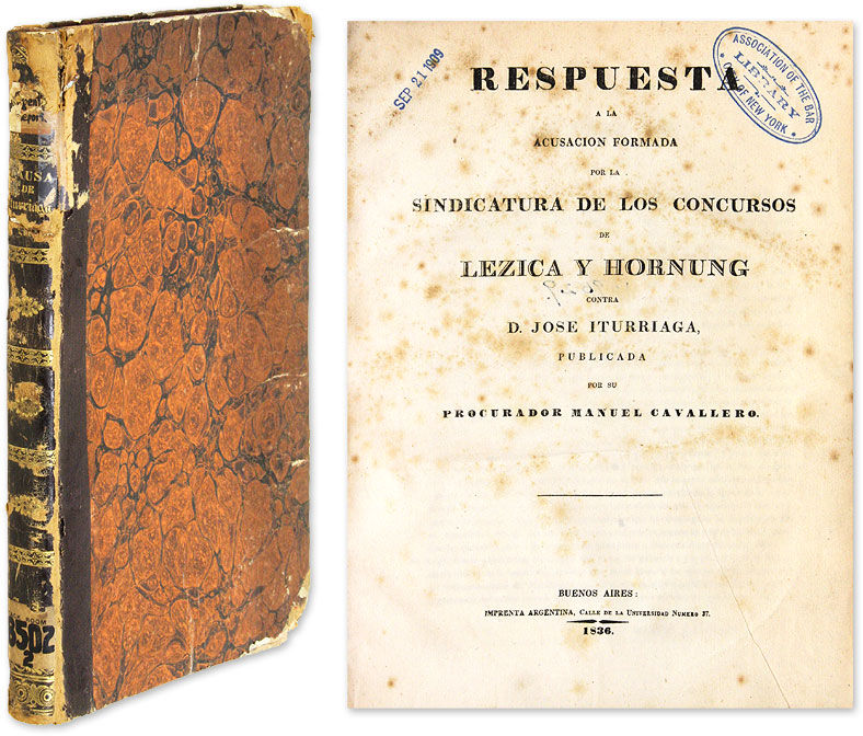 1836. Buenos Aires: Imprenta Argentina, 1836.. Buenos Aires: Imprenta Argentina, 1836. Notable Fraud Case at an Important Argentinian Trading House [Trial]. [Iturriaga, Jose de, Defendant]. Cavallero, Manuel. Respuesta a la Acusacion Formada por la Sindicatura de los Concursos de Lezica y Hornung Contra D. Jose Iturriaga. Buenos Aires: Imprenta Argentina, 1836. [iv], 47 pp. [Bound with] I[turriaga], J[ose de]. Breve Contestacion al Libelo Publicado por Manuel Sainz de la Maza. Buenos Aires: Imprenta Argentina, 1836. 8 pp. [And] O., G. Manifesto en Derecho a Favor de Jose de Iturriaga, Acusado de Ocultacion de Unos Ganados y de Complicidad en la Falsificacion de su Firma, Ejecutada por Federico Hornung. [Buenos Aires]: Imprenta Argentina, [1836]. 83 pp. Contemporary quarter calf over marbled boards, gilt ornaments and title (reading Causa de Iturriaga) to spine. Rubbing to extremities with heavy wear to corners, chipping to head of spine, hinges starting, owner bookplate to front pastedown. Manuscript divisional title pages between items. Moderate toning and occasional foxing to text, internally clean. Ex-library. Location label to spine, small inkstamps to title page of Respuesta, brief annotations to verso. Solid copies of three rare items. $750. * Only editions. These items relate to a trial that followed the collapse of a notable Argentinian trading house. "Corruption or mismanagement by employees or partners of non-British houses frequently made news during the century. One of the more celebrated cases was the failure of Sebastian Lezica Brothers in September 1835. The manager of the house, a German named Frederick Hornung, apparently forged bills of exchange without the knowledge of his employers, three Argentine brothers. After the failure of a British house, Thwaites and Company, and after the retention of money in the Chilean branch, the Lezica Brothers had to raise money. Originally Hartung procured the signatures of a number of people, including Thwaites; but when persons declined, he began to forge names on bills of exchange--both the drawer's and drawee's names--in order to prevent bankruptcy. He thought this would need to be done for only a short time, but he became involved until the total sum owed the market was over one and a half million pesos." (Reber). OCLC locates 1 copy of Respuesta (at UC-Berkeley), 1 copy of Breve Contestacion (at the.