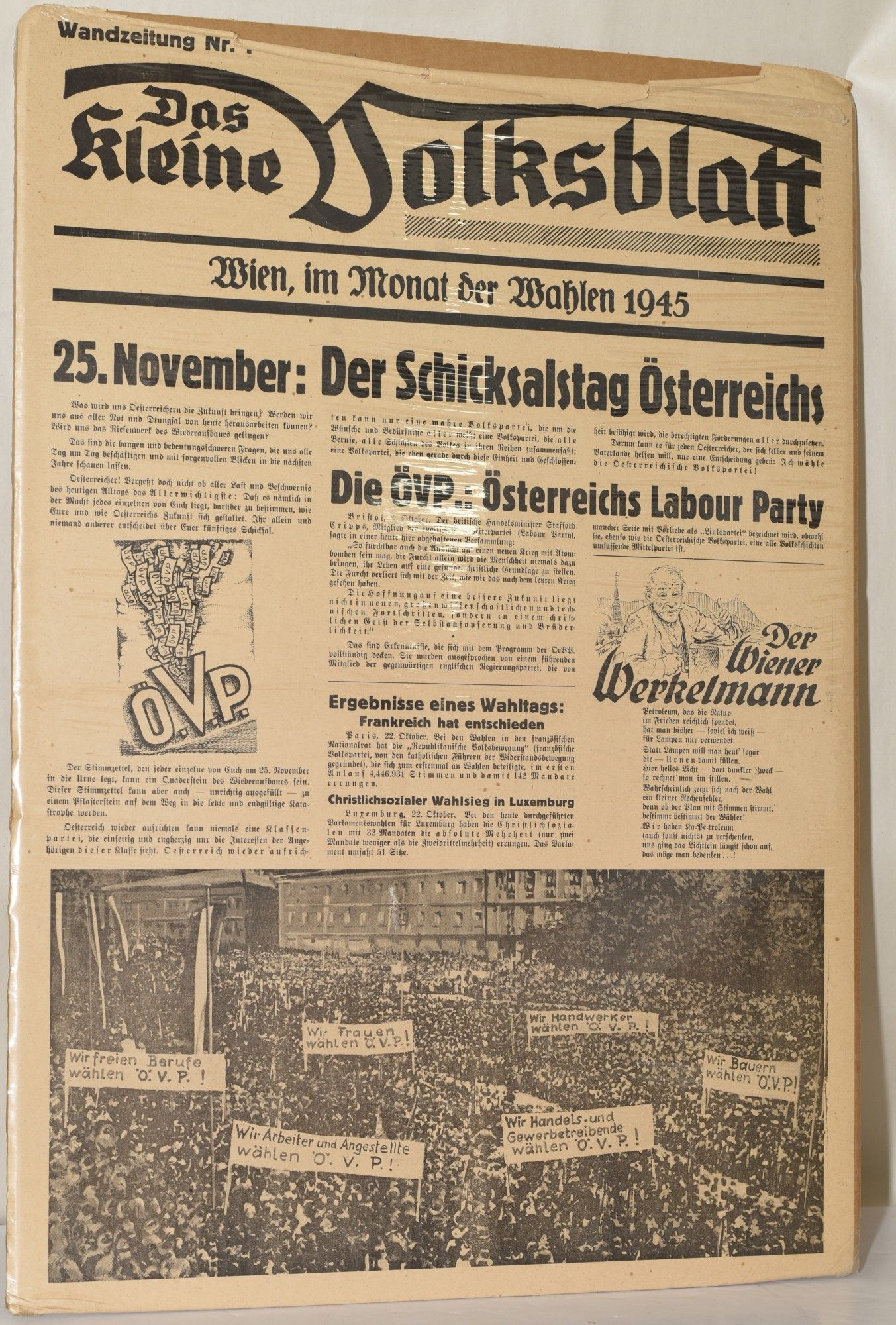 Vienna, 1945. A "Wandzeitung" or "Wall-Newspaper" simultaneously promoting the reeemergence of "Das Kleine Volksblatt" and the newly formed Austrian People's Party (or Osterreich Volkspartei)."Wandzeitung" were generally produced in quantity and affixed with glue to walls.~~The Kleine Volksblatt,or "The Little People's Journal" was established in 1929 as a small format Viennese daily newspaper. It reemerged after the War as the OVP dailiy newspaper was, until July 1947, the central organ of the party.~~Despite its name, the OVP has a center-right orientation (much as the term "Nazi" has the term "Socialist" in its name.) The current version of the "OVP" was organized in April 1945, and this broadside bears the date 1945 and the place of origin, Vienna, or "Wien."~~The OVP today, and historically, represents conservatism, with a platform of stability of social order. In recent years it has expressed skepticism of affirmative action, rights of sexual minorities and other forms of social engineering.~~Few "wall-newspapers" survived, given that they were attached to buildings, trees, or other fixtures. Tthis one is in excellent condition, with a single fold. The broadside clearly was designed to promote the paper's new iteration and the nascent OVP.~~.