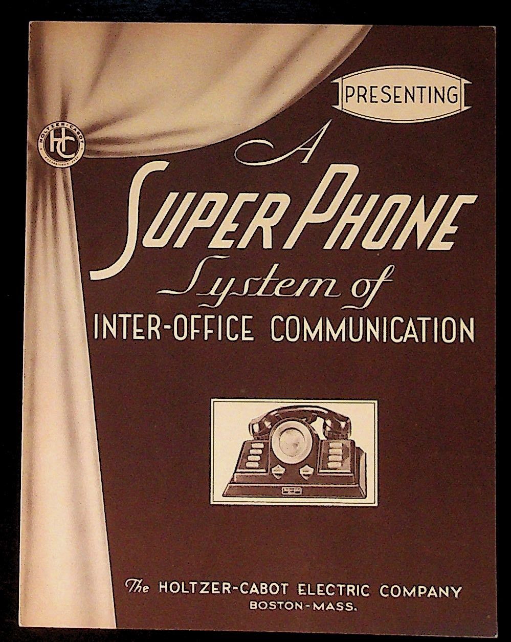 Boston: Holtzer-Cabot, 1940. Paperback. Very Good. Paperback. An advertising piece for an early executive control system from Holtzer-Cabot Electric, a Boston company specializing in motors, telegraphs and telephones, and fire alarm systems. They closed in 1972. A four-page folder on card stock with pictures of the phones and speaker, and a detachable postcard for requesting more information. Very good condition. Science and technology SCI/020215.