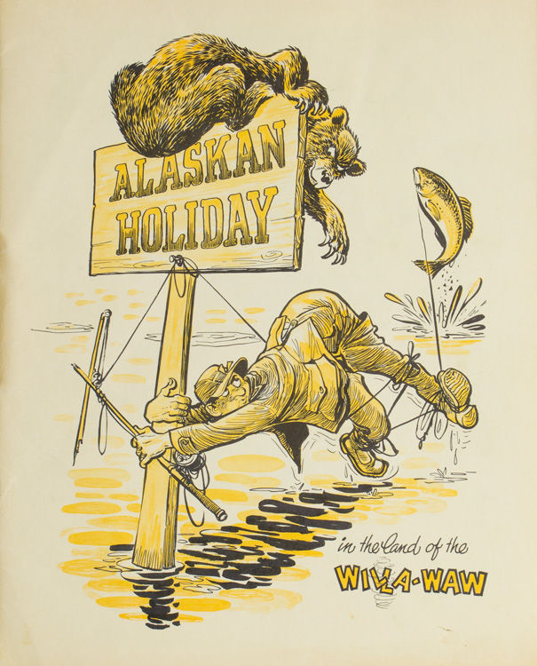 [N.p., Vancouver, 1961. Illustrated by Lew Saw (Alan Pratt, Seattle Times). 15 pp. 1 vols. 4to. Illustrated self-wrappers. Illustrated by Lew Saw (Alan Pratt, Seattle Times). 15 pp. 1 vols. 4to. Privately printed account of a fishing trip by Donald Bates of Portland, B.C. lumber Baron H.R. MacMillan, Canadian Air Vice-Marshal Leigh Stevenson, and “one Indian” (the author, Fred Auger, publisher of the Vancouver Province newspaper) for steelhead, grayling, and salmon on the Kvichak River in western Alaska.