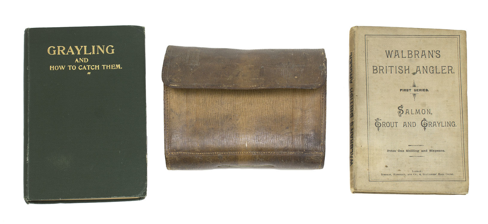 Leeds; Scarborough, 1895. Title and 12 pp. fly patterns (listing 48 in all), printed on vellum, with pockets opposite, and felt sheets and additional pockets. With 88 inserted flies. 3 vols. 8vo. Fly wallet in full brown morocco, small title in gilt under flap. Some soiling to first and last leaves of vellum, owner name at head of title, a dozen flies showing signs of wear. Books in original tan or green cloth, minor soiling and wear, very good. Bookplate. Custom cloth folding box. Title and 12 pp. fly patterns (listing 48 in all), printed on vellum, with pockets opposite, and felt sheets and additional pockets. With 88 inserted flies. 3 vols. 8vo. Choice angling Wallet (with specimen flies) from the Leeds author, editor, and tackle manufacturer Francis M. Walbran, whose advertisements describe his establishment as “The Northern Anglers’ Depôt”, and whose emphasis is upon the Yorkshire rivers. Westwood & Satchell Supplement, p. 255; Heckscher 1998; Coleby p. 73; Hampton’s Angling Bibliography p. 284