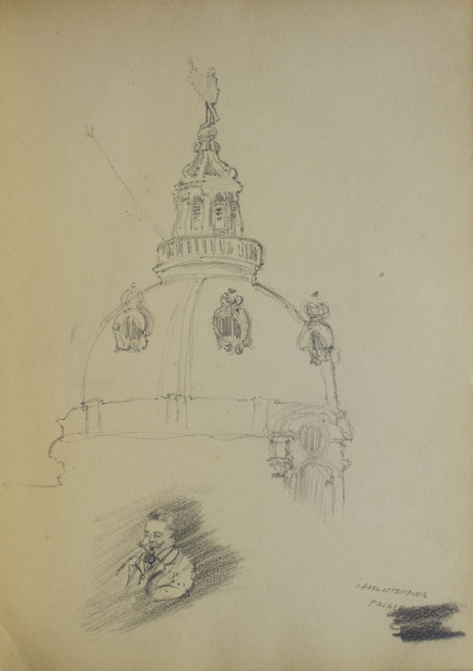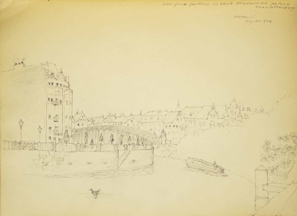 [Berlin, Charlottenburg], 1908. 37 leaves. 4to. Cloth and boards, worn, interior fine. 37 leaves. 4to. Includes dated drawings of on the Spree River, as seen from the gardens behind the Fredericks Palace, Berlin (May 20, 1908) and King William's Hunting lodge in Grunwald (May 21, 1908), as well as statues, landscapes, and architecture in Charlottenburg and Grunwald.