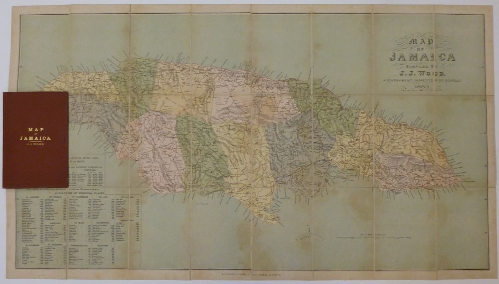 Kingston, Jamaica: McCartney and Wood, 1883. Case map. Color lithograph. Original cloth case with folding map, dissected on linen in 36 squares. Front of map reads, Compiled by J.J. Wood, a government inspector of schools. Image measures 21" x 37.5". 1883.