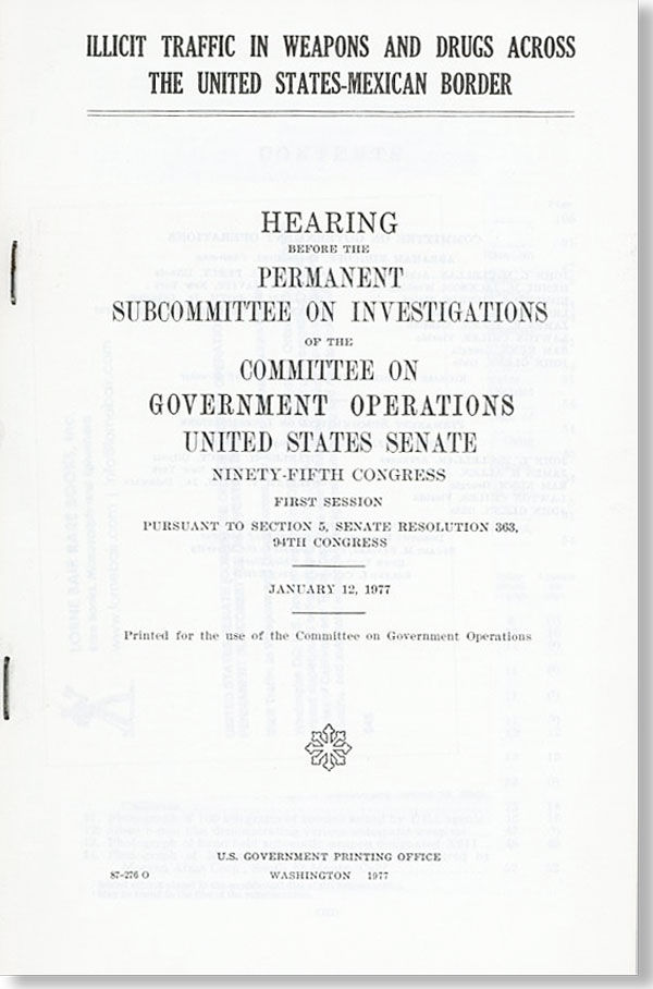 Washington DC: U.S. Government Printing Office, 1977. First Edition. Octavo (23cm.); original printed staplebound self-wrappers; iv,107pp.; illus. Slight creasing to text, still Near Fine. Report of investigations held in the states of California and Texas, complete with photographic evidence involving marijuana, cocaine, and automatic weapons used against Cuban drug lord Alberto Sicilia-Falcon.