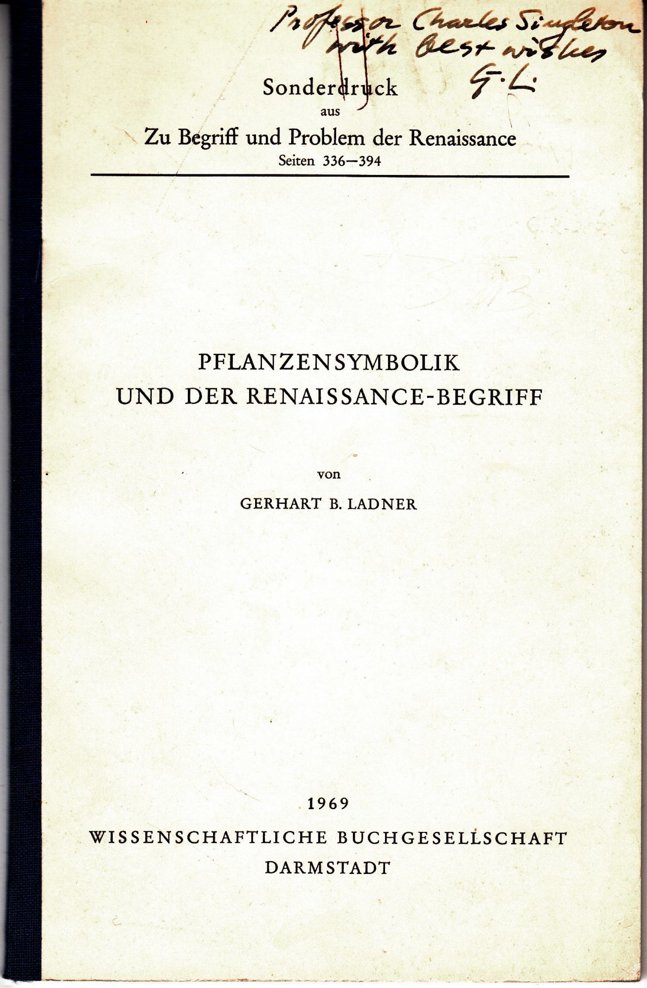 Darmstadt: Wissenschaftliche Buchgesellschaft, 1969. Paperback. Very Good. Paperback. Excerpt taken from Sonderdruck aus zu Begriff und Problem der Renaissance. Very good in white paper wrappers with blue cloth spine and title to front cover in black. Thin octavo. Presentation copy with inscription on front cover. Paperclip rust marking on front cover across signature and to first few pages of text. Insides are clean and bright (except for paperclip marking). German. 59 pages numbered 335 to 394. German Art. GER/2073.