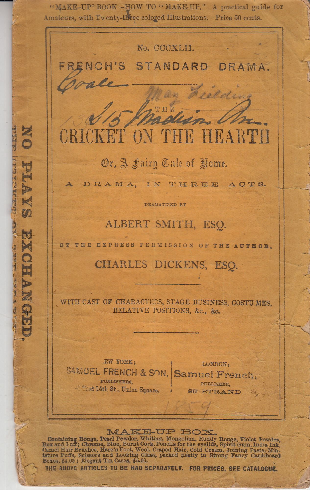 New York: Samuel French & Son, 1887. Paperback. Very Good. Paperback. Very good in original yellow paper wrappers with black title to front wrapper. Minor edgewear to exterior inclused creasing, chipping, and a few small closed tears. Previous owner's address written in 19th-century scrawl to front wrapper and to title page. occasional markings in pencil to text. Text is bright. The play was dramatized by Smith with the express permission of Dickens. 31 pages. Drama. DRA8/4042.