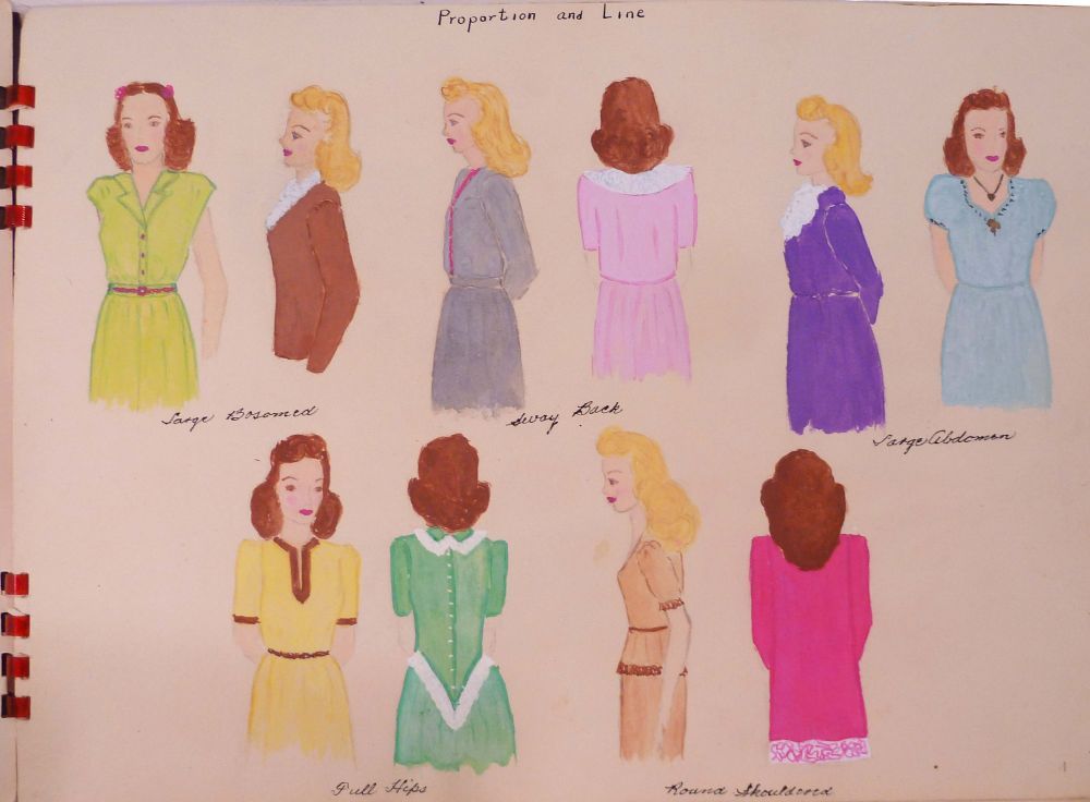 Np: Np, 1950. First edition. Spiral Bound. Partly spiral bound black (front cover) and beige (back cover) stiff boards. Very good. 22 unnumbered leaves. Oblong folio, 25 x 36 cm. Numerous watercolor pen and ink illustrations, pencil and charcoal, and tipped-in designs [nine are tipped-in fabric samples]. Fashion manuscript by a young Coos Bay, Oregon student. She includes skirt, blouse, and sleeve designs for wool, cotton and synthetic fabrics, all are designs for women with varying proportions -- dress and fashion designs to scale with fabric samples depicting plain, knit, basket, pile and silk weaves, as well as weaving instructions.