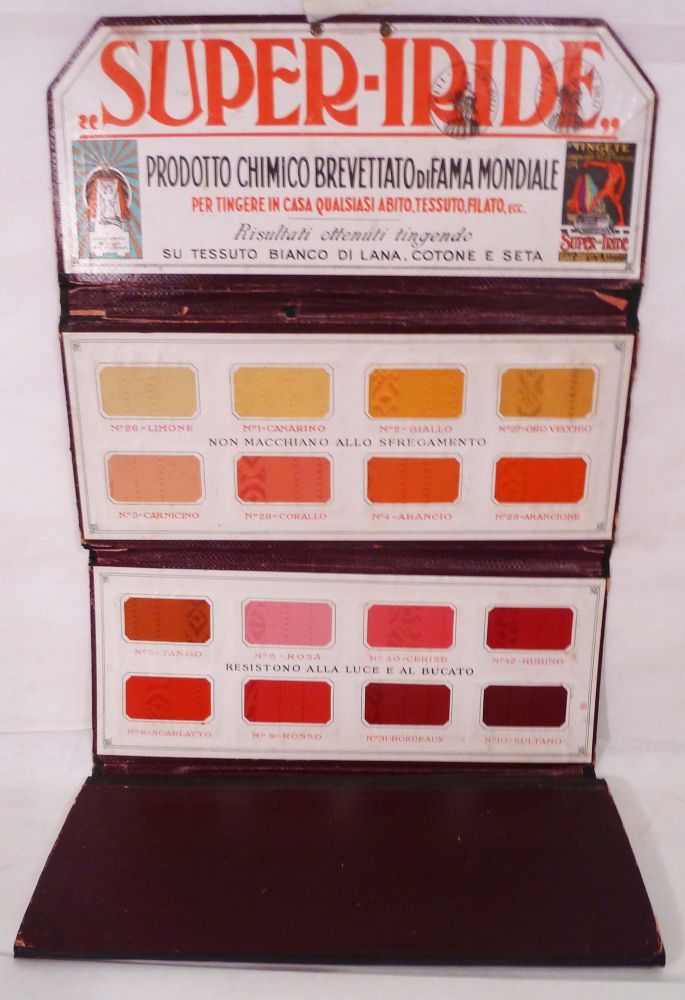 Prato: Ditta Ruggero Benelli, 1900. First edition. Hardcover. Panels are faux-diced shagreen, gilt lettering first panel, two brass rivets front cover for hanging the display. Very good. 27.5 x 13 cm. Salesman's sample advertising display for Super-Iride, 48 dyed sample mounted, eight panels bound accordion style, each panel as noted previously, folds out to approximately 40 inches when displayed. Color plates mounted on first and last panels with 48 dyed fabric sample in a wide range of colors, lettering in black and red. Super-Iride solid dyes are Azo synthetic, more stable than vegetable, and/or aniline dyes provide a distinct advantage for coloring wool, cotton and silks as they are highly resistant to sun and repeated washing. This brand is perhaps best known for the advertising poster of a looming red devil drawing forth a rainbow of color from a wooden barrel depicted here in the first panel. Scuffing to extremities, back cover with, slight loss of shagreen at back cover.