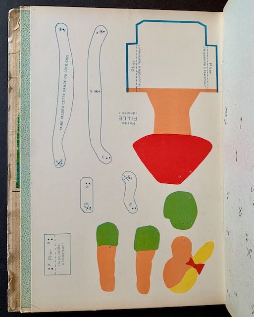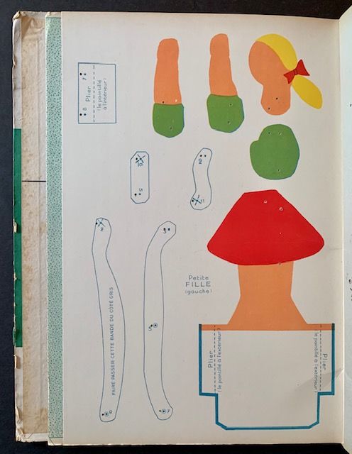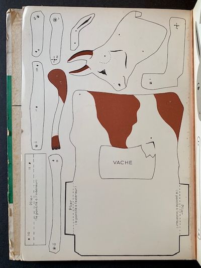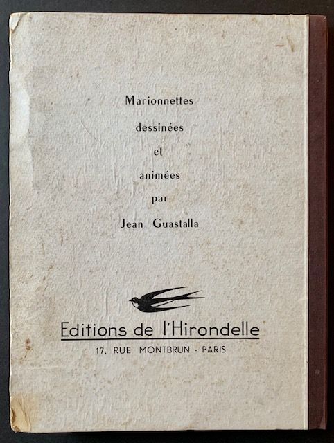 Paris: Editions De L'Hirondelle, 1937. 1st. Hardcover. Collectible; Very Good. Charming 1937 French children's puppet book. Folio, complete in 12 separate thick cardboard sheets, 4 of which are designed to build the puppet theatre and the other 8 representing the puppets themselves (in order: a left-pointing young girl, a left-pointing dog, a left-pointing young boy and cat, a cow, a donkey, a right-pointing young boy and cat, a right-pointing dog and, finally, a right-pointing young girl). All the brightly-colored sheets are complete and in clean, Near Fine to Fine condition. The covers and pastedowns show a bit of spotting and wear but are still solidly VG and very presentable. All the marionettes (as stated on the back cover) are designed and illustrated by Jean Guastalla.