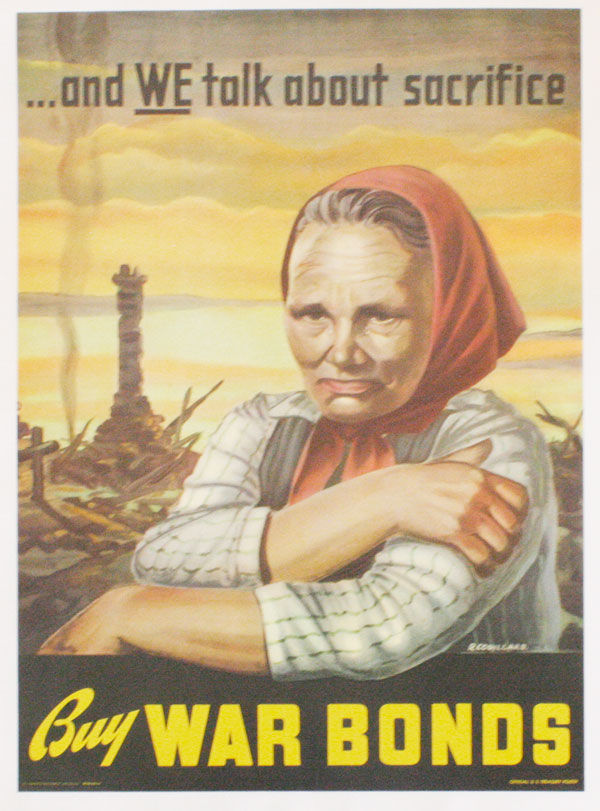 Treasury Department-issued War Bonds poster, featuring an illustration of a Russian peasant woman weeping in front of the smoking rubble of her home directly beneath the slogan "...and WE talk about sacrifice." Meant to provide a measure of perspective to Americans on the homefront who, in the face of rationing and wartime restrictions, were being asked by their government to invest in War Bonds. The message is quite clear: during wartime, all must sacrifice, and some sacrifice more than others. Designed by Canadian artist Roger Couillard, best known for his numerous travel posters and ads for the Canadian Pacific Railway.