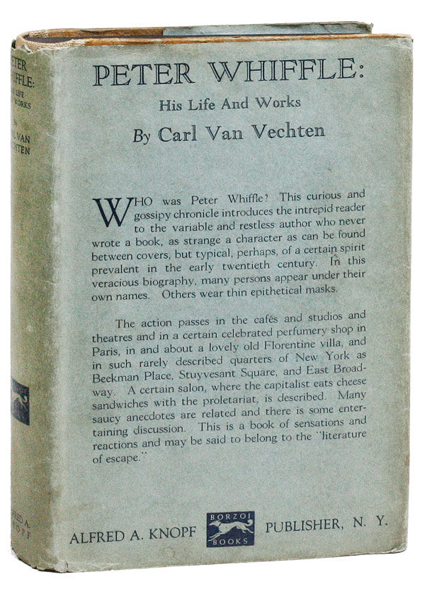 New York: Alfred A. Knopf, 1922. First Edition. Octavo. Linen-backed, batik-decorated boards; paper spine label; black top-stain; dustwrapper; 247pp. Nice, tight copy, just lightly faded at board extremities, in the scarce original dustwrapper, unclipped but mildly eroded at spine ends and with gentle soil at flap-folds; still easily Very Good. Van Vechten's most enduring work, a satirical portrait of bohemian Americans abroad, some real, some fictional, including the title character Peter Whiffle, "the variable and restless author who never wrote a book." COAN p.119. HANNA 3618.