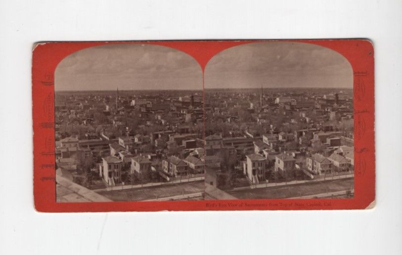 Marysville, Cal: J. J. Reilly, Photographer. Very Good. Stereoview [9 cm x 17.5 cm] Orange mount. No backstamp. The image is the same as No. 122 (Note, the caption is a bit different- "Bird's Eye" and "Capital"). Light edgewear. Minor staining to the reverse.