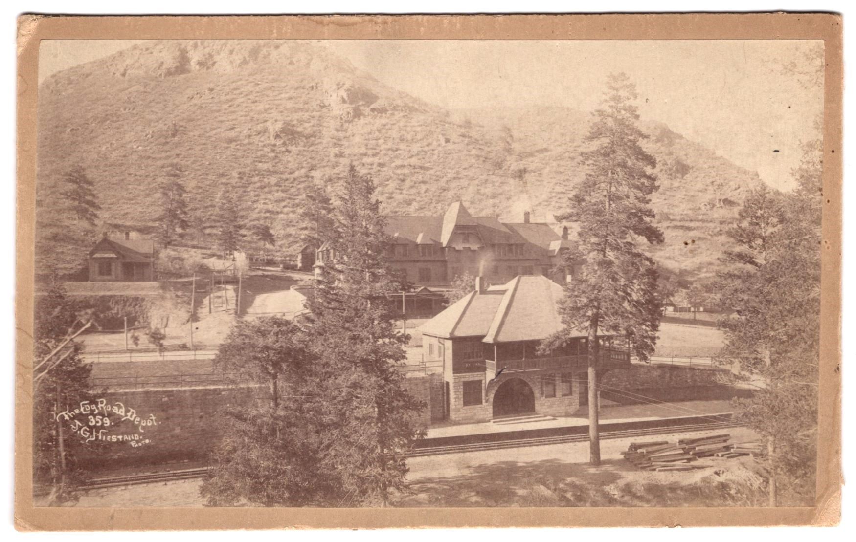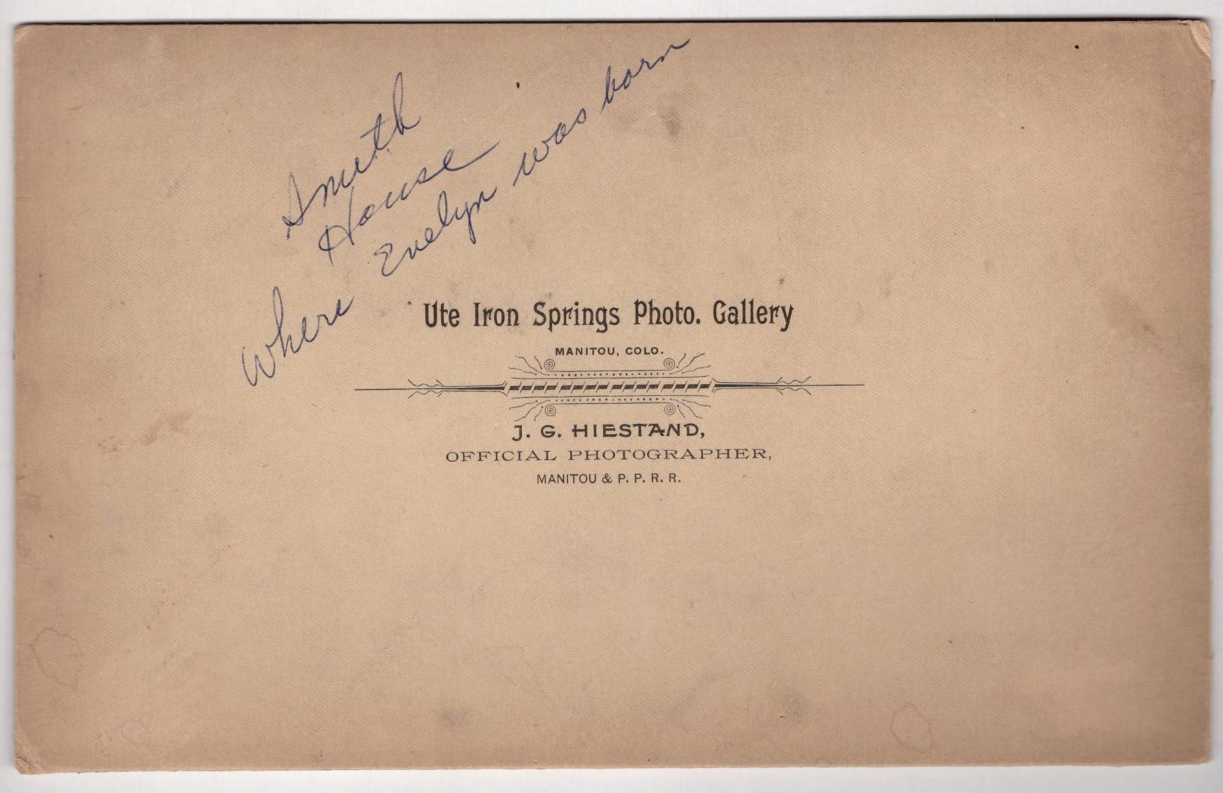 Manitou, CO: Ute Iron Springs Photo. Gallery; J. G. Hiestand, Official Photographer. Very Good. Cabinet card [20 cm x 13 cm]. Ute Iron Springs Photo. Gallery backstamp. Minor wear at corners. Ink inscription on reverse: "Smith House - where Evelyn was born" Cog Railway, Pikes Peak.