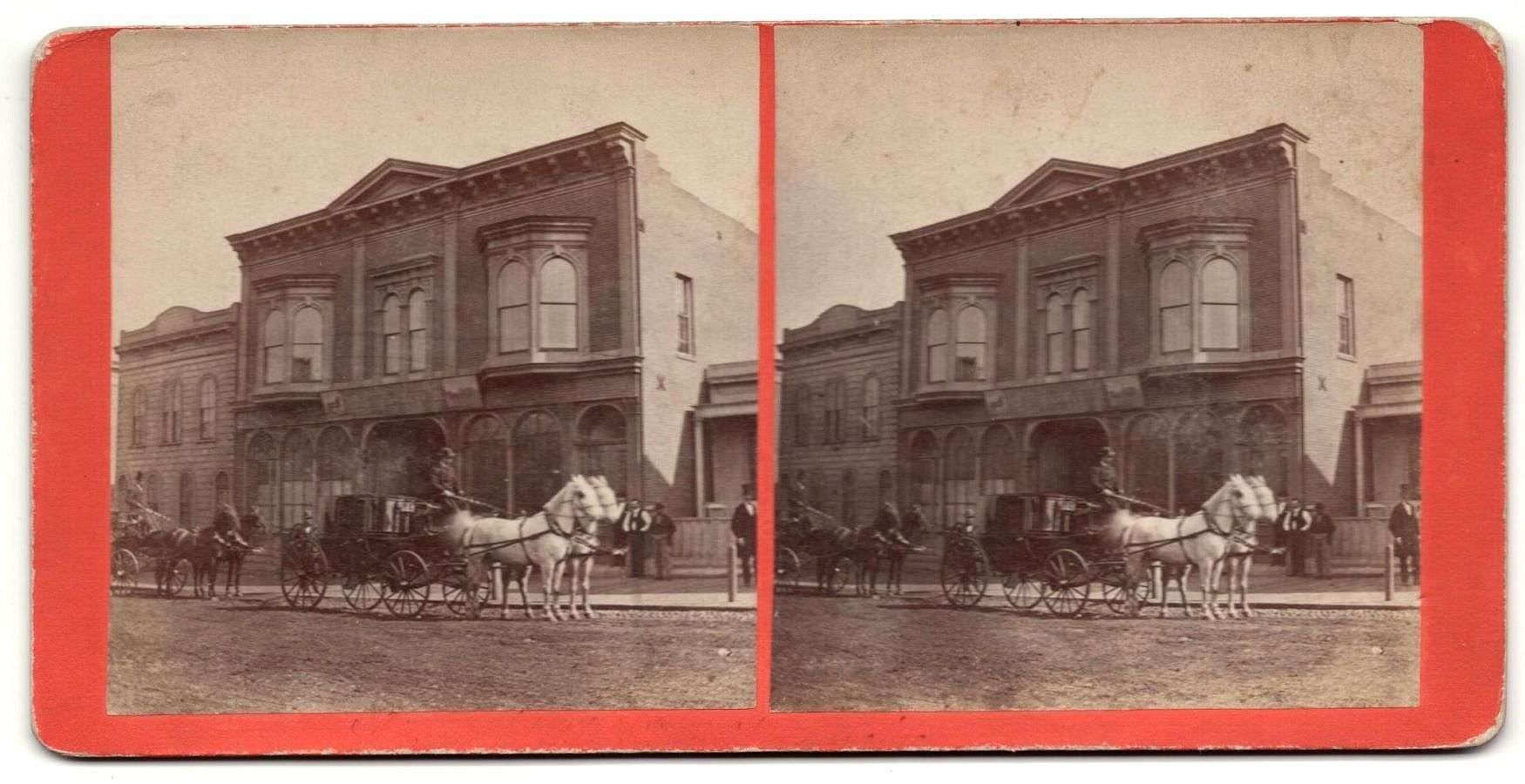 [San Francisco, CA?], 1875. Stereoview [17.5 cm x 9.5 cm] Orange mount. No backstamp. Image shows a stagecoach in front of the J.H. Swain Livery Stable (identified by sign). The 1875 directory of San Francisco gives the address of Josiah H. Swain's livery stable as 417 Folsom. Very good.