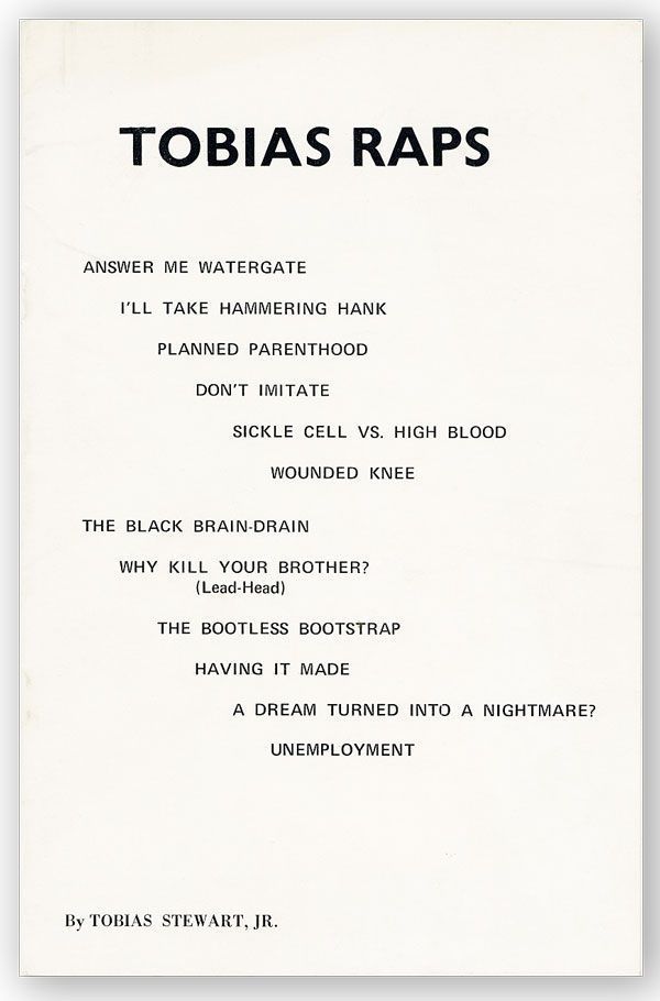 [Macon, GA]: Macon Press Co, 1973. First Edition. Slim octavo (21cm.); original white staplebound wrappers; [16]pp. Fine. Scarce, self-published volume of "experience poetry" by the native Atlanta author. Contents deal with issues of health ("Sickle Cell vs. High Blood"), the death of Martin Luther King, Jr. ("A Dream Turned Into a Nightmare?"), violence ("Why Kill Your Brother?"), and contraception ("Planned Parenthood"), among others. OCLC notes 4 holdings (Howard, Wake Forest, Brown, and Radford).