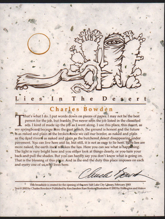 Salt Lake City, UT: Ken Sanders Rare Books, 2003. First edition. Broadside. SIGNED. LIMITED EDITION. [28cm x 22cm]. Hand-made paper, printed broadside. As new. Illustrated by Pat Eddington and Susan Makov. One of 100 total copies. Signed by Charles Bowden.