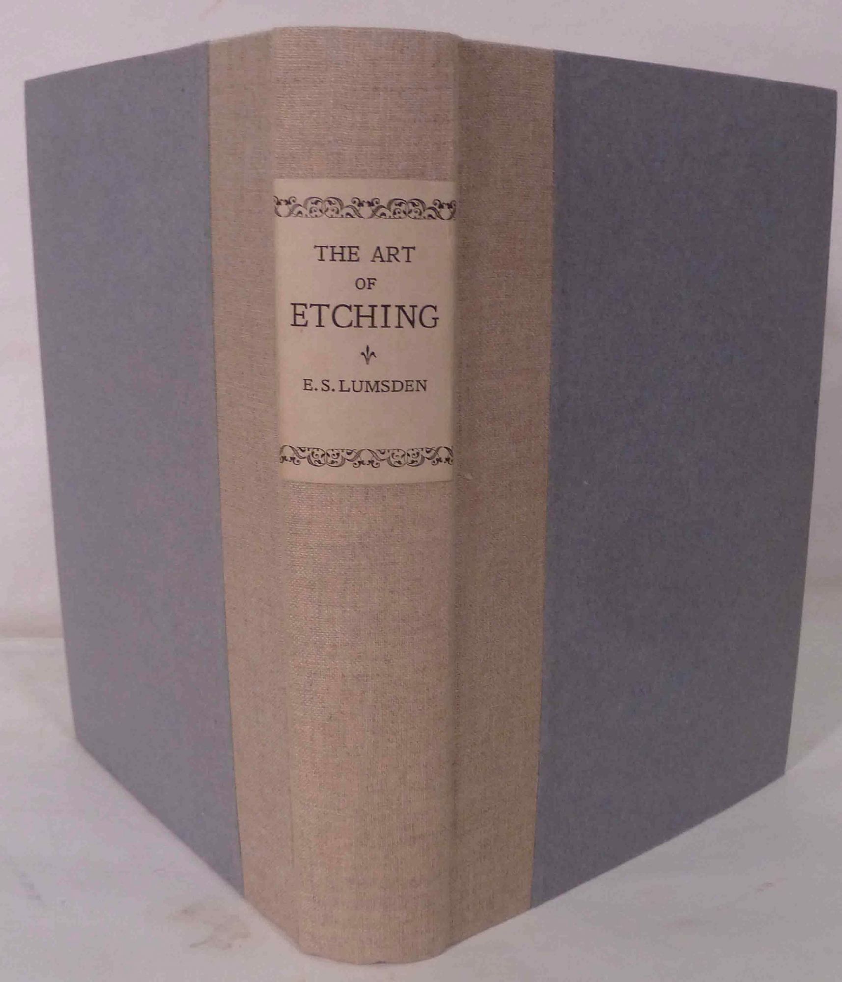 London: Seeley, Service & Co. Limited, 1925. First edition. Hardcover. Beige cloth backed, pale blue paper covered boards with paper spine label, professionally recased. Teg. Fine. 376 pages. 21 x 15 cm. Limited edition, copy 117 of 150 (145 for sale). With 205 illustrations and four original etchings by the author, signed or initialed by the author. Lumsden describes the history and development of etching through Rembrandt, Goya and the etching revival; and he reproduced personal, illustrated notes from several eminent etchers of the period on their techniques including: Marius Bauer, Frank Benson, Muirhead Bone, George Clausen, David Young Cameron, Frank Short, Augustus John, Frank Brangwyn, James McBey, Edmund Blampied, Percy Smith, Christopher Nevinson, Laura Knight, and John Everett. Clean, very bright copy, spine paper label, owner inscription front free, endpaper, dealer stamp half-title.