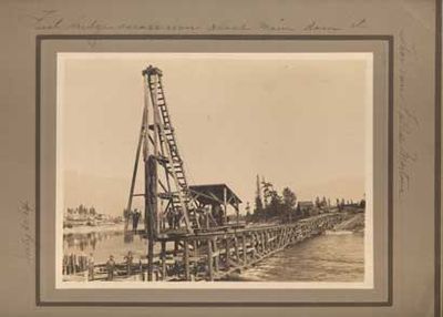 1914. Photograph. Very Good. Large format photograph [16 x 21 cm] on a light brown mount [25 x 30 cm] with embossed and dark brown borders. No backstamp. Mount is creased and bumped in a few places with a small split and a small loss at bottom right. Photograph is only lightly rubbed, but still unfaded and with nice contrasts. Shows several workers on and around the bridge. Written in contemporary pen on the front of the mount, in the margins: "First Bridge across river above Main Dam at Thompson Falls, Montana. July 30, [19]14