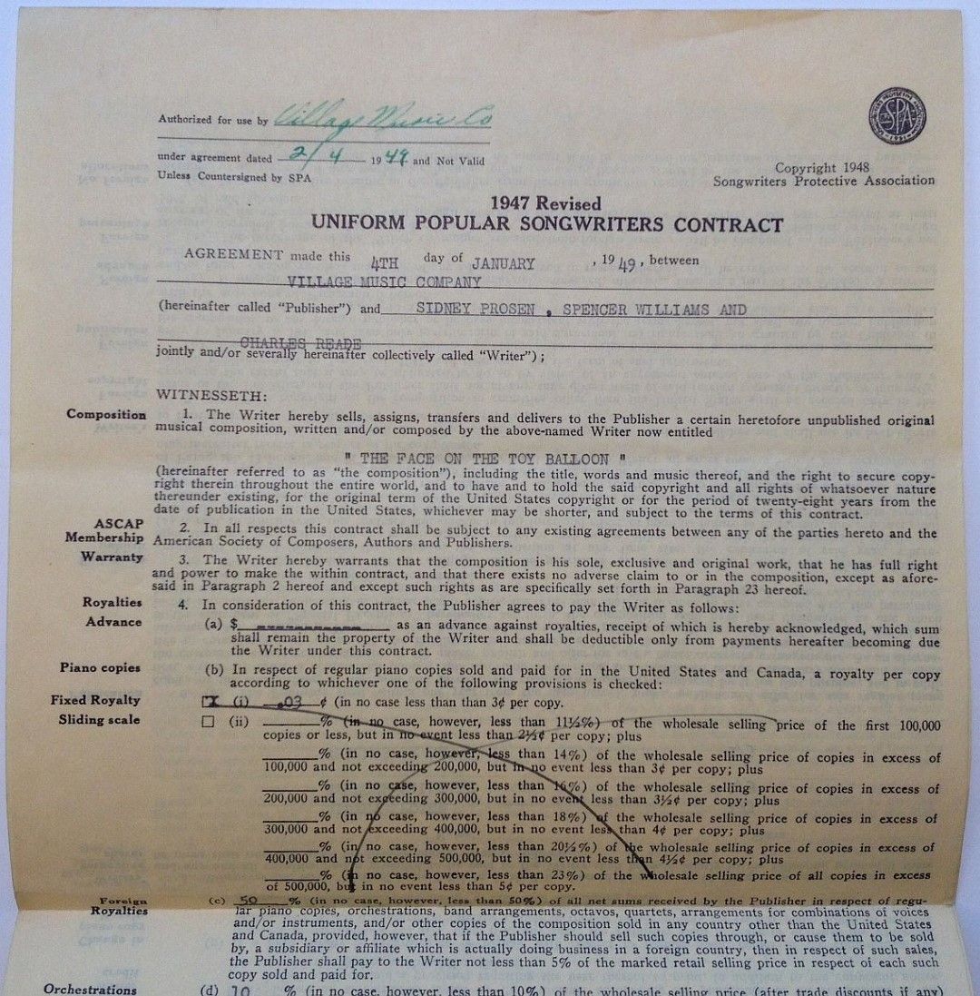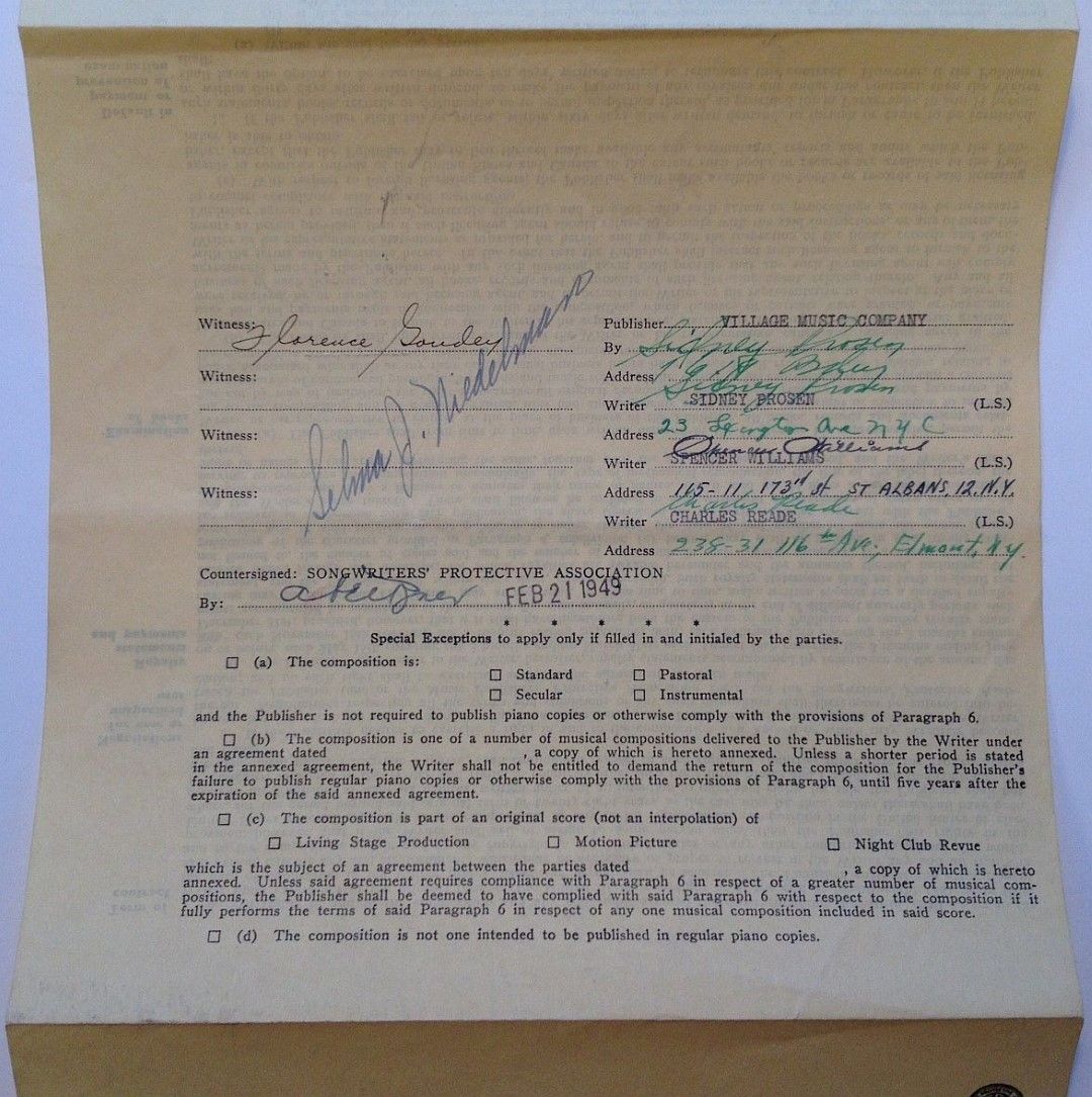 1949. unbound. Exceedingly rare signed music publishing contract from the vaults of Hometown - Village Music, 4 pages, 32.5 inches (when unfolded fully) x 8.5 inches, February 21, 1949, whereby Spencer Williams and Charles Reade agree to publish their music with Sidney Prosen and agree to divide all proceeds at the rate of 1/3 share (each). Boldly signed by all parties including Spencer who has used his address as 115 - 11 173rd street St Albans, New York - which was Louie Armstrong's house! Note: Spencer died in 1965, and there is virtually nothing of his on the market. The Schomberg Library, arguably the largest repository of Black historical material in the United States, possesses not a single signed item. Without a doubt, Spencer is much rarer than Charlie Parker and Bix Beiderbecke. Near fine condition.