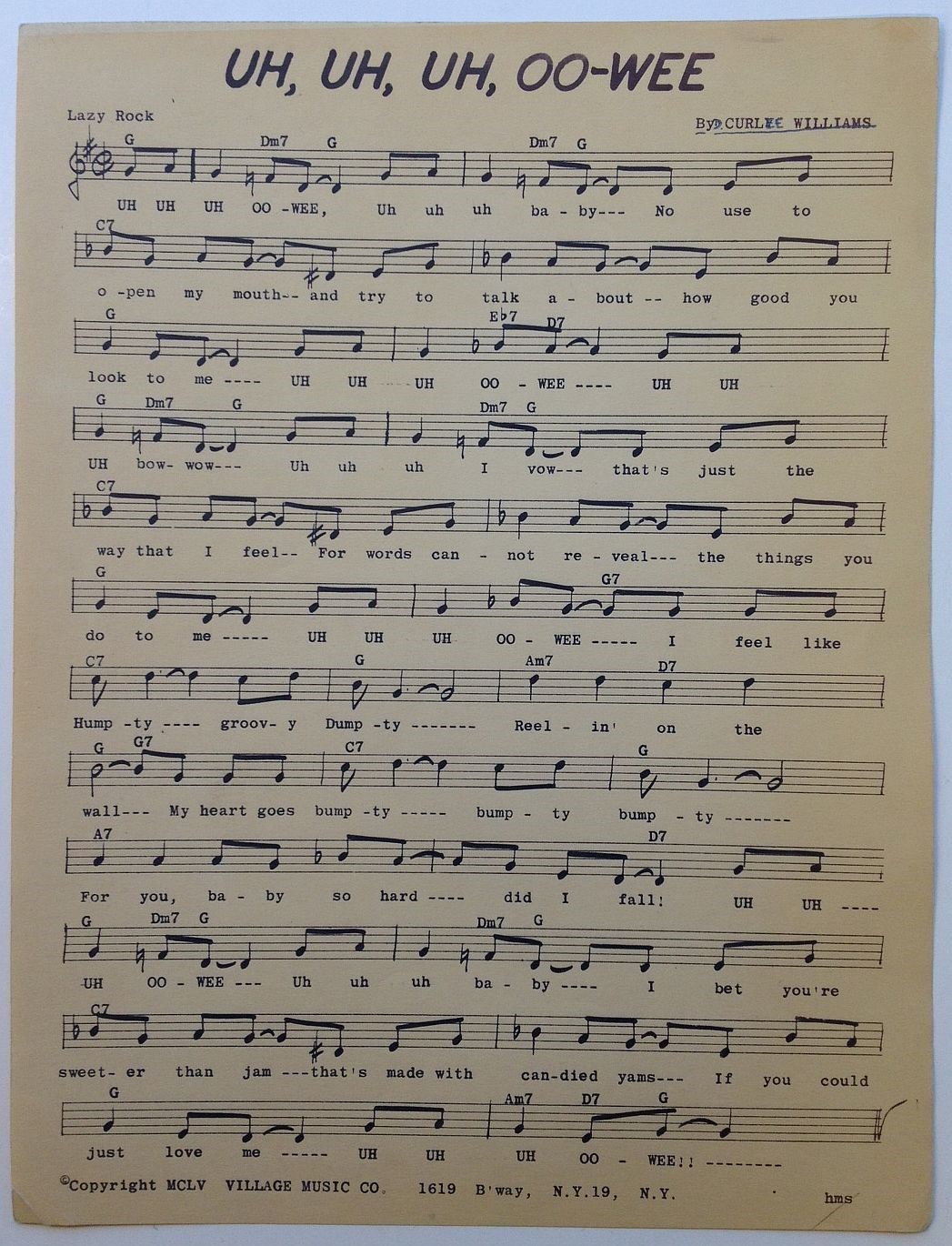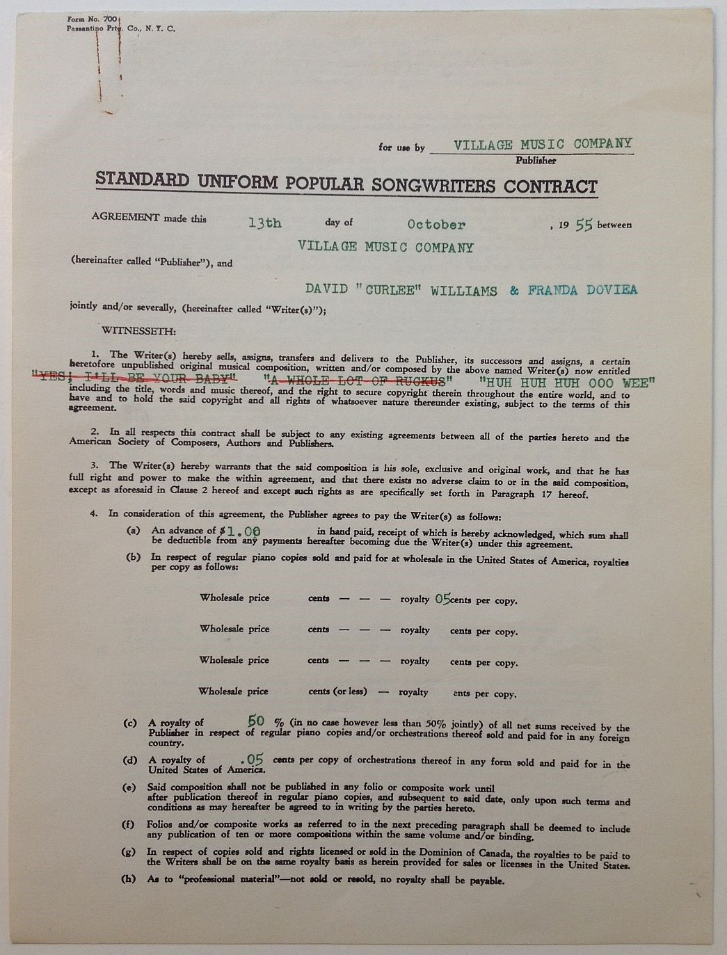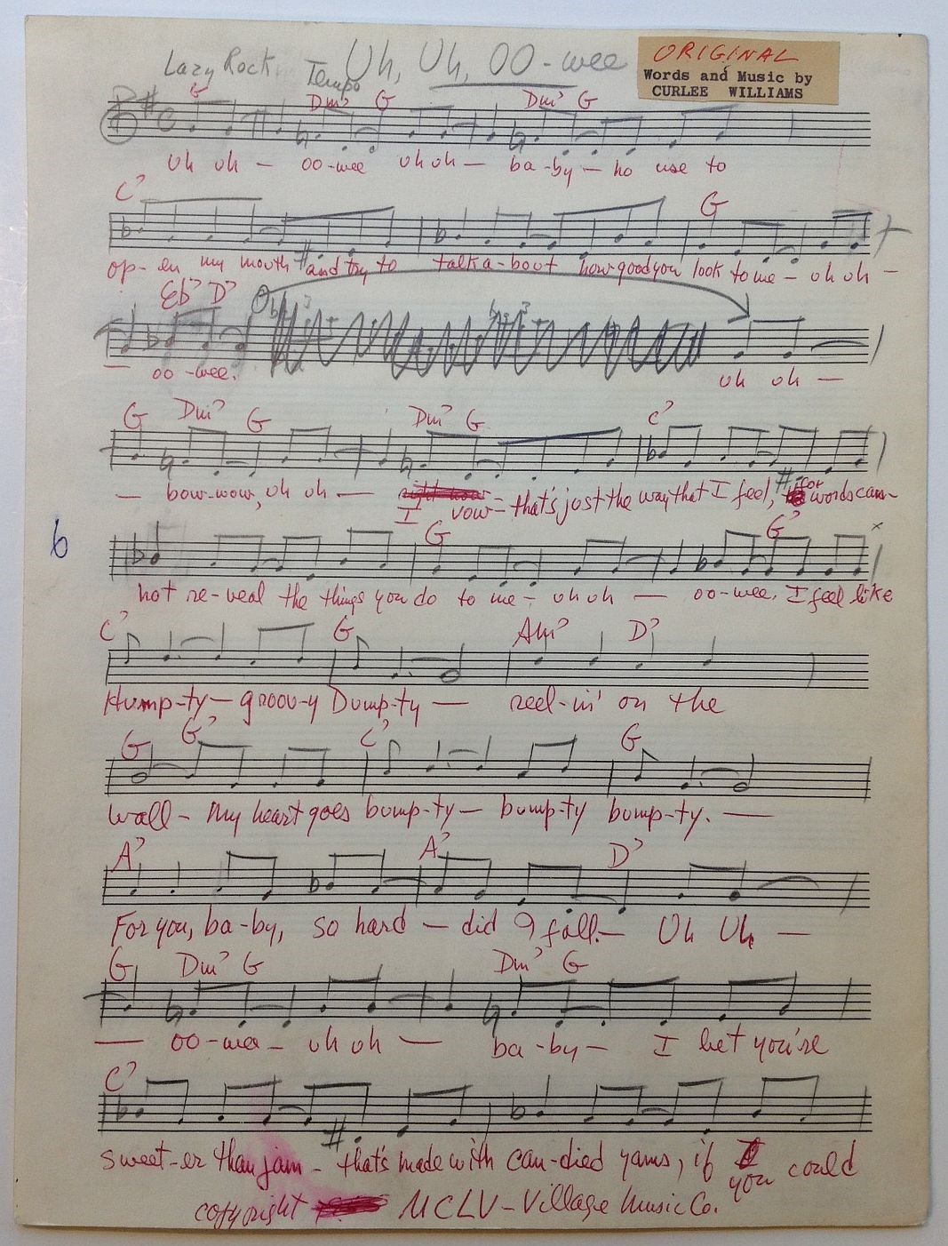 New York, 1955. unbound. Exceptional small archive consisting of a Dave "Curlee" Williams original autographed manuscript score and lyrics for his song "Uh, Uh, OO - Wee," 12.5 x 9.5 inched, 2 pages, with corrections and changes, Village Music, New York City, copyright 1955; accompanied by the original printed solicitation sheet music of the final draft, sent to vocalists and record company personnel. Also included is a signed standard uniform popular songwriters contract, 11 x 8.25 inches, 2 pages, October 13, 1955, between Dave "Curlee" Williams and Sidney Prosen, whereby Williams agrees to consign the song to publisher Hometown Music, for certain considerations. The contract has a paperclip stain in the upper left corner, but otherwise the items are in near fine condition.