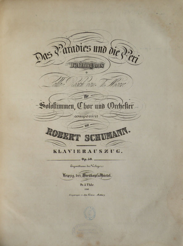 [Op. 50]. Das Paradies und die Peri. Dichtung aus Lalla Rookh von Th. Moore für Solostimmen, Chor und Orchester... Klavierauszug. Op. 50... Pr. 5 Thlr. [Piano-vocal score]