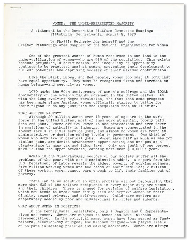 Pittsburgh, 1970. First Edition. Quarto (27.25cm.); two mimeographed stapled leaves; 3pp. A bit worn from handling, else Very Good and sound. "A statement to the Democratic Platform Committee Hearings, Pittsburgh, Pennsylvania, August 5, 1970," in part for the Greater Pittsburgh Area Chapter of the National Organization for Women. Unlocated in OCLC as of April, 2015.