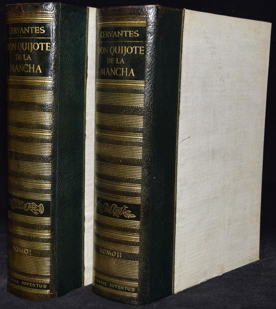Barcelona: Editorial Juventud, 1950. Quarter Leather. Very Good binding. A handsome production, printed in Barcelona, and in 2 volumes. Backed in green morocco over cream linen-covered boards. The spine have elaborate stamping. The colored illustrations by Jose Narro, as well as the headpieces to each chapter, are charming. There is some light soiling to the linen boards; but overall a clean copy without any marks. Mylar has been custom cut to protect the bindings. Very Good binding.