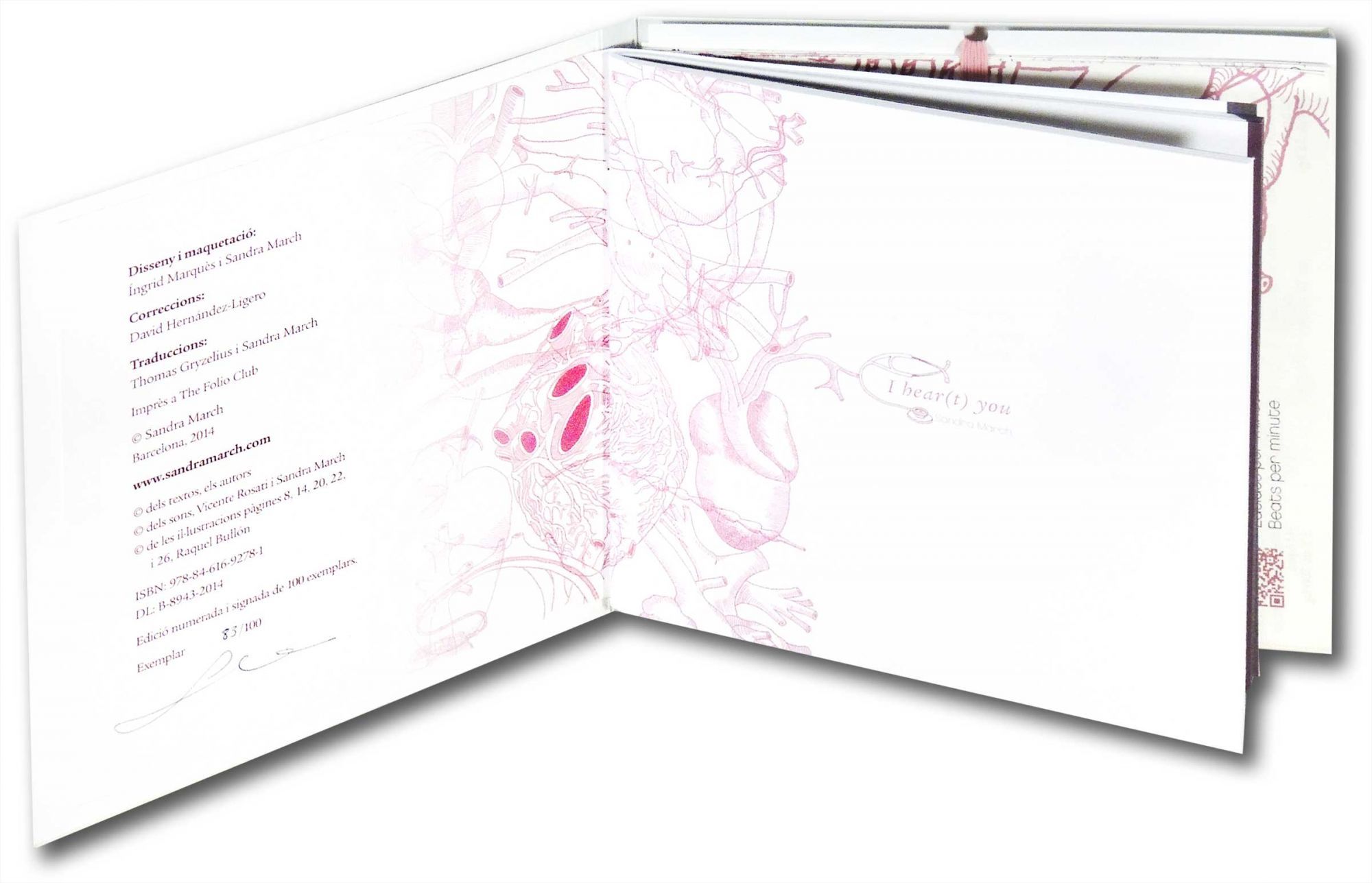 Barcelona: Printed at The Folio Club for Sandra March, 2014. Hardcover. Fine. Hardcover. Number 83 of 100 copies signed and numbered by Sandra March. Text in Spanish, Catalan, and English. March is a talented young book and installation artist. With this work she draws a metaphorical, graphic, and auditory journey captured by words, illustrations, and sound. Thus the contents comprise the book, two posters, and a CD. She writes that this project has a scientific basis with a therapeutic and artistic impulse, starting on a subconscious level after losing both her sister and her father from heart diseases. The journey goes from a symbolic loss of the heart until its restoration, through a tour of the beautiful and varied morphology of the cardiac systems of thirty-one different animals and the sounds of their heartbeats. The heartbeat sounds are from a jellyfish, starfish, black widow spider, giant tortoise, Nile crocodile, frog, parakeet, and human being among many others There were a number of contributors to this project, including the biologist Francesc Uribe Porta, sound engineer Vicente Rosati, and illustrator Raquel Bullon. Bound in a white cardboard CD case, with posters attached to the back cover by a pink elastic band and CD held on the middle fold of the case. In fine condition. 58 pages. PRI/042715.