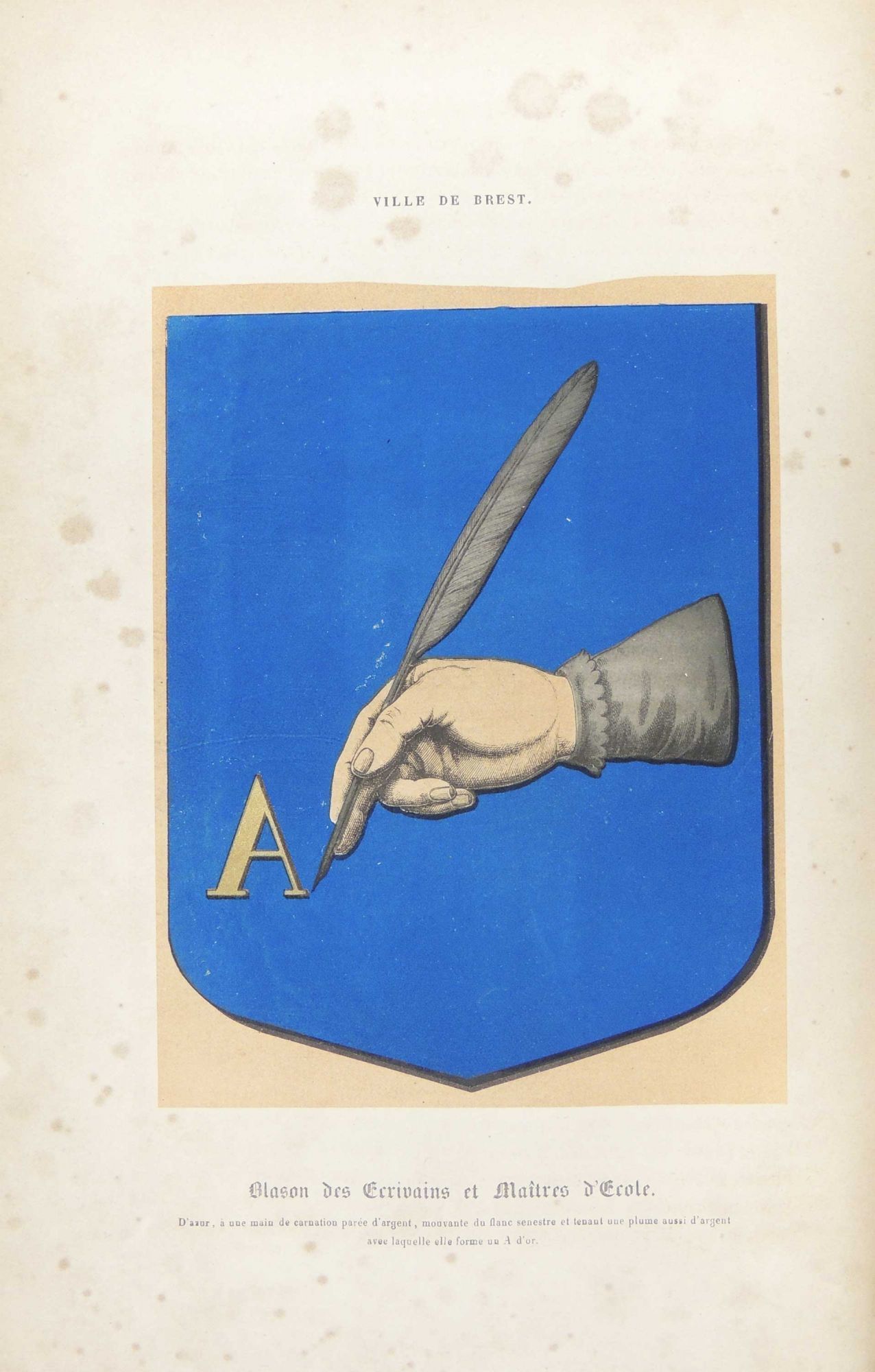 Paris: Librairie Historique, Archeologique et Scientifique de Sere, 1852. Hardcover. Very Good. Hardcover. IN FRENCH. The only edition of this book with many illustrations including four color plates, one fold-out plate, coats of arms, printers marks, initials, and more. Very good in quarter green leather with turquoise cloth covered boards and gilt title to spine. Four raised bands to spine. Rubbing and a few pulls to leather along spine and hinges. Minor wear to corners and edges of boards. Heavy foxing to interior; although, color plates remain vibrant. Marbled endpages and bookplate of Harry Rabinoqitz. Size: thin quarto.160 pages. FRE/042815.