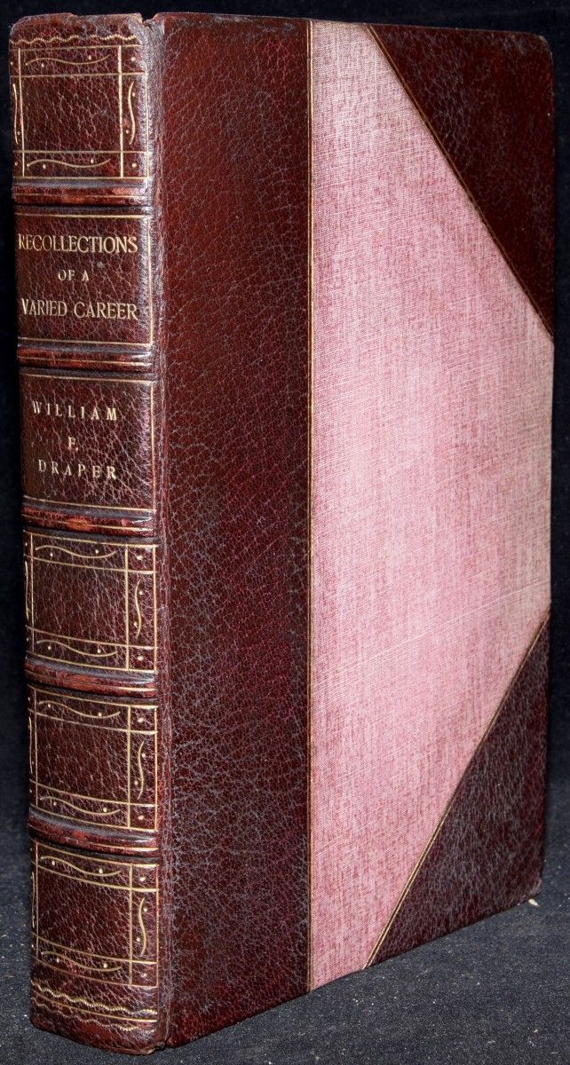 Boston, MA: Little, Brown & Co, 1908. First Edition. Three Quarters Leather. Very Good+ binding. While this memoirs covers many different aspects of Drapers “Varied Career”, Bud Robertson notes in the Nevins bibliography that “[o]ver a third of this autobiography recounts Draper’s experiences as an officer in the 36th Massachusetts, IX Corps [Nevins I, 83]. This copy in a handsome 3/4 morocco over buckram binding; marbled endpapers and silk ribbon marker bound in. From the personal library of Bud Robertson, with his bookplate to the front pastedown. (Nevins I, 83). Very Good+ binding.